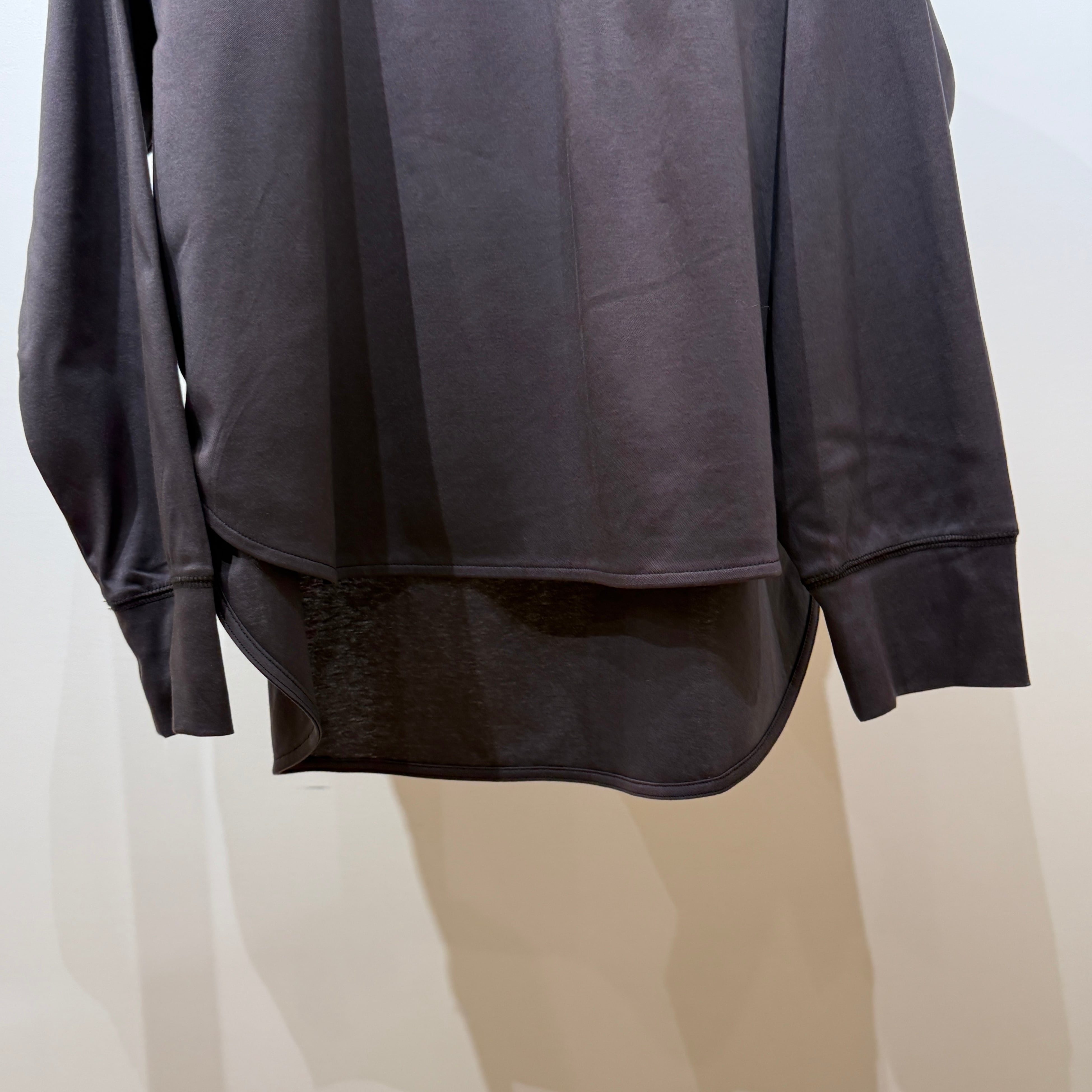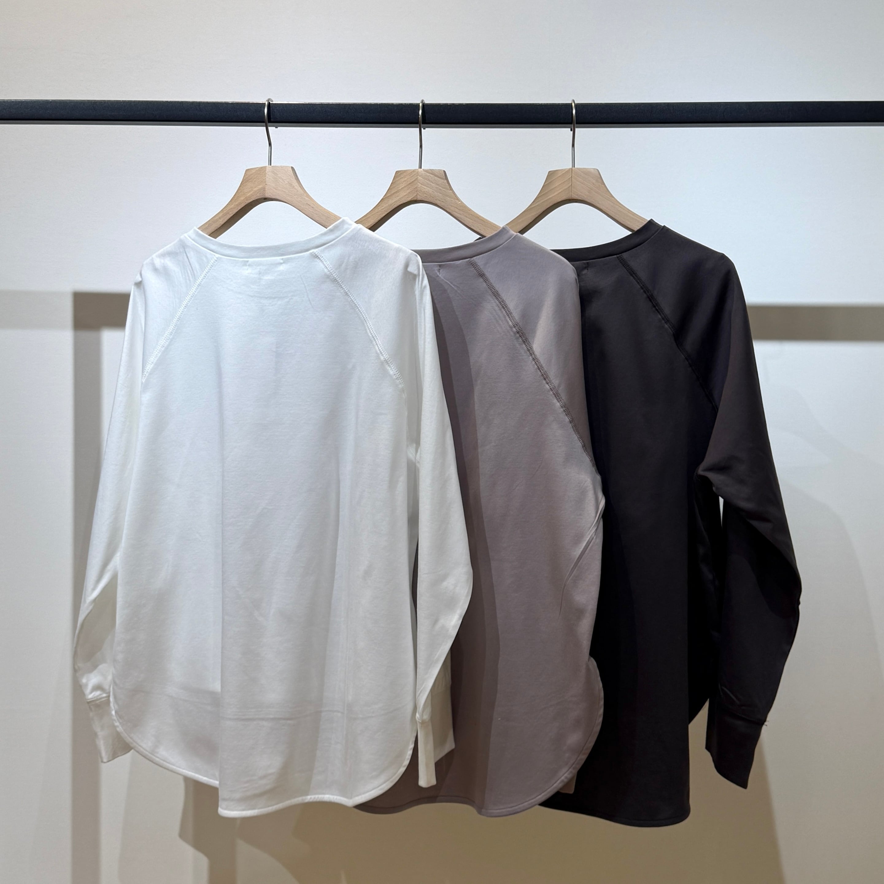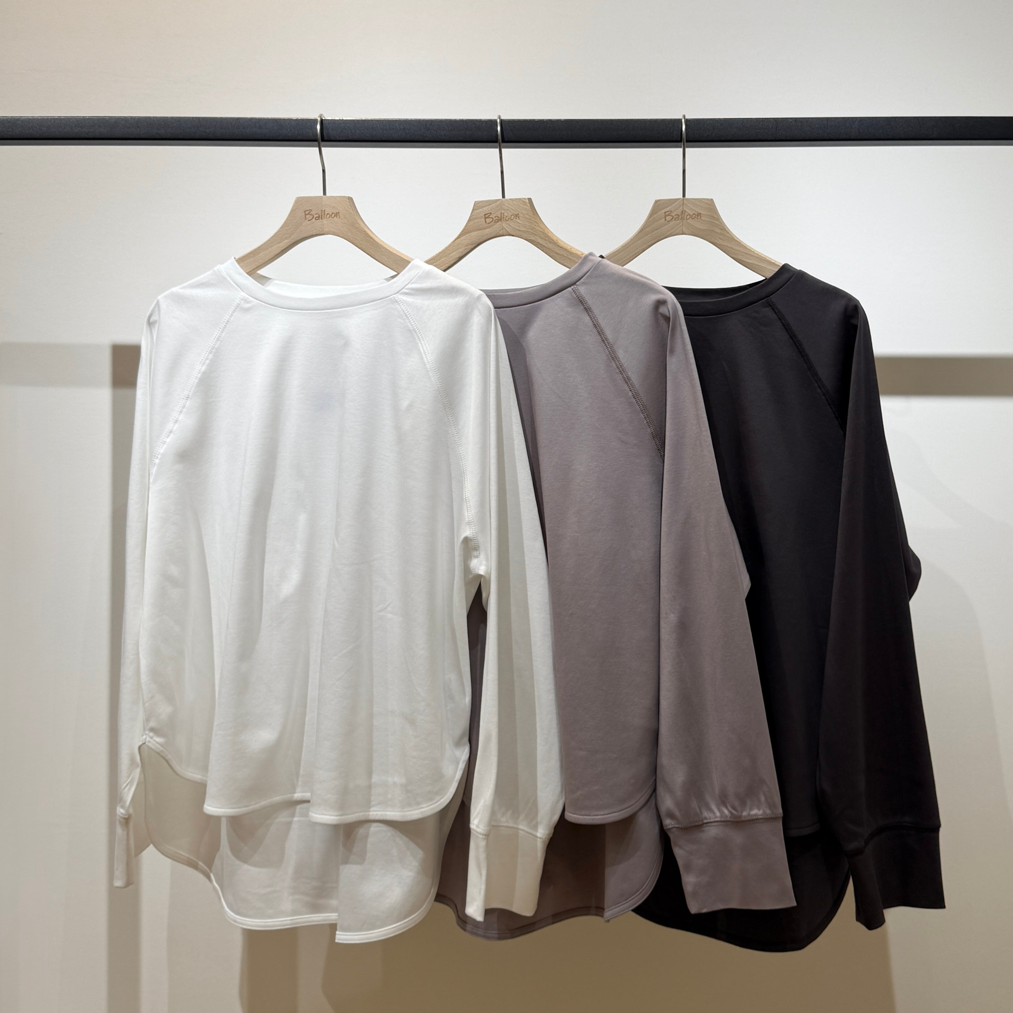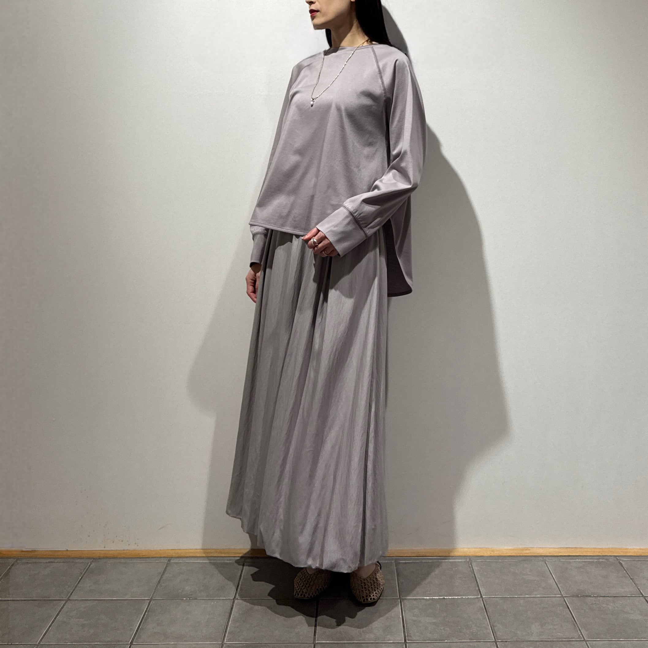 ラグランスリーブのゆったり設計に、前後差のある着丈とラウンド裾で抜け感のあるシルエット。