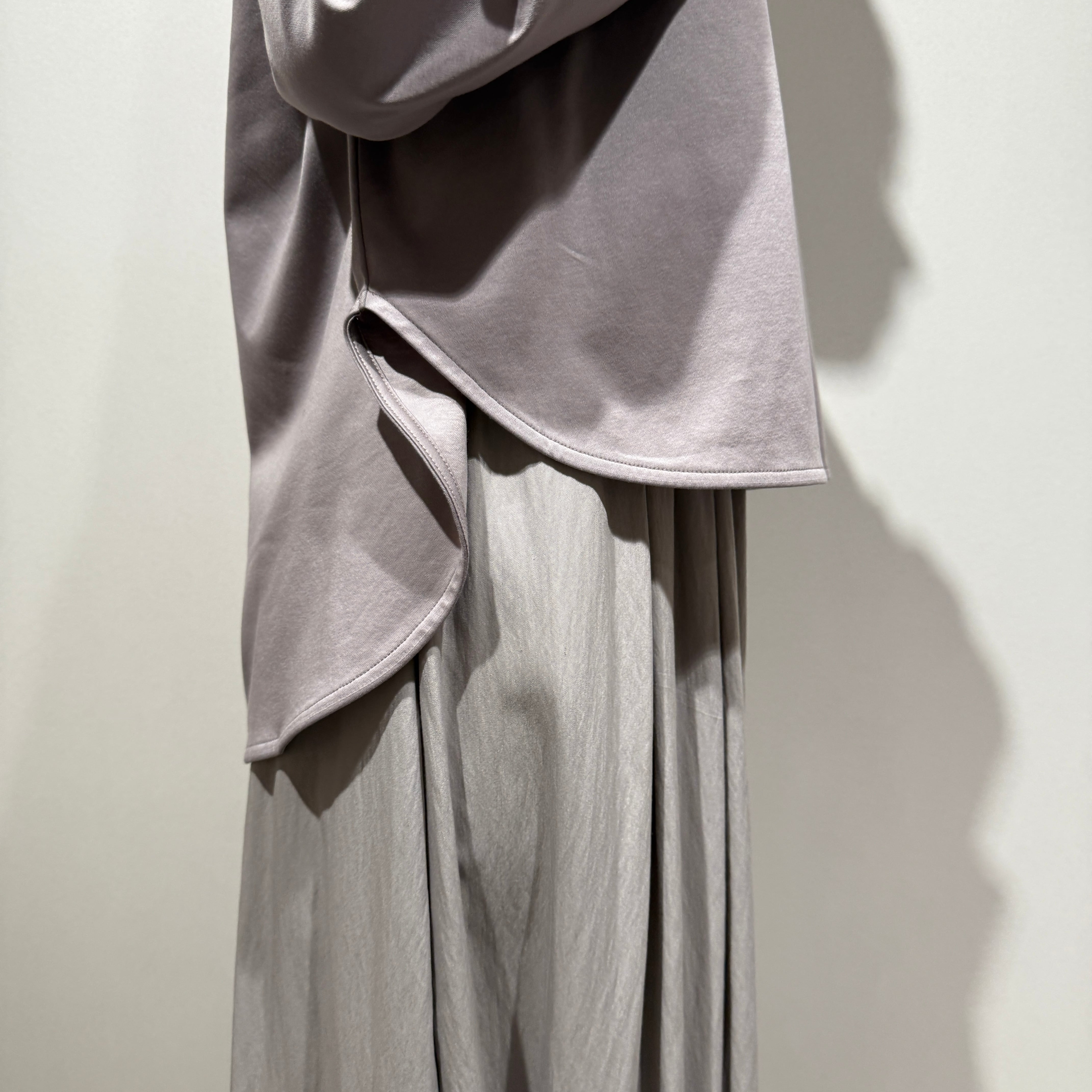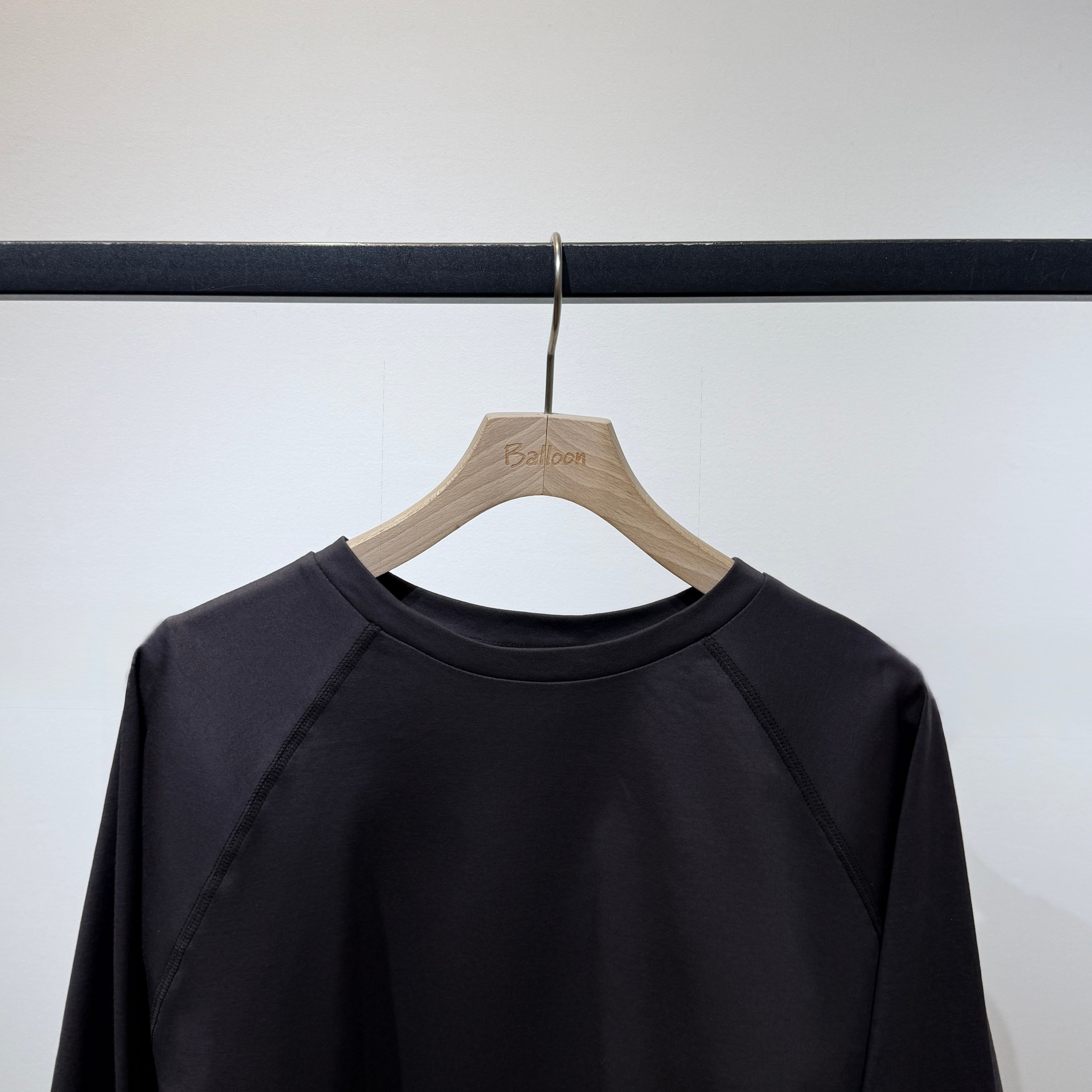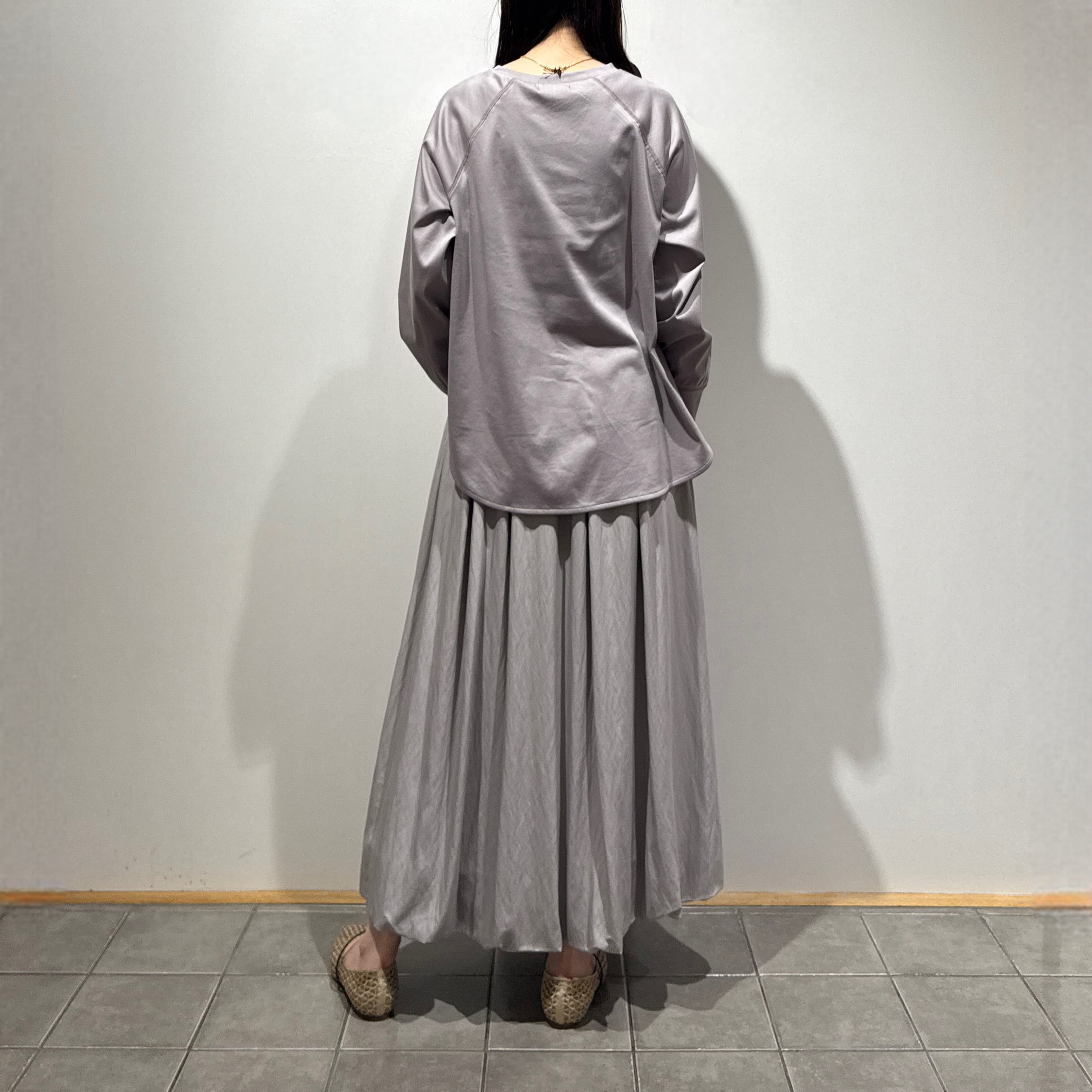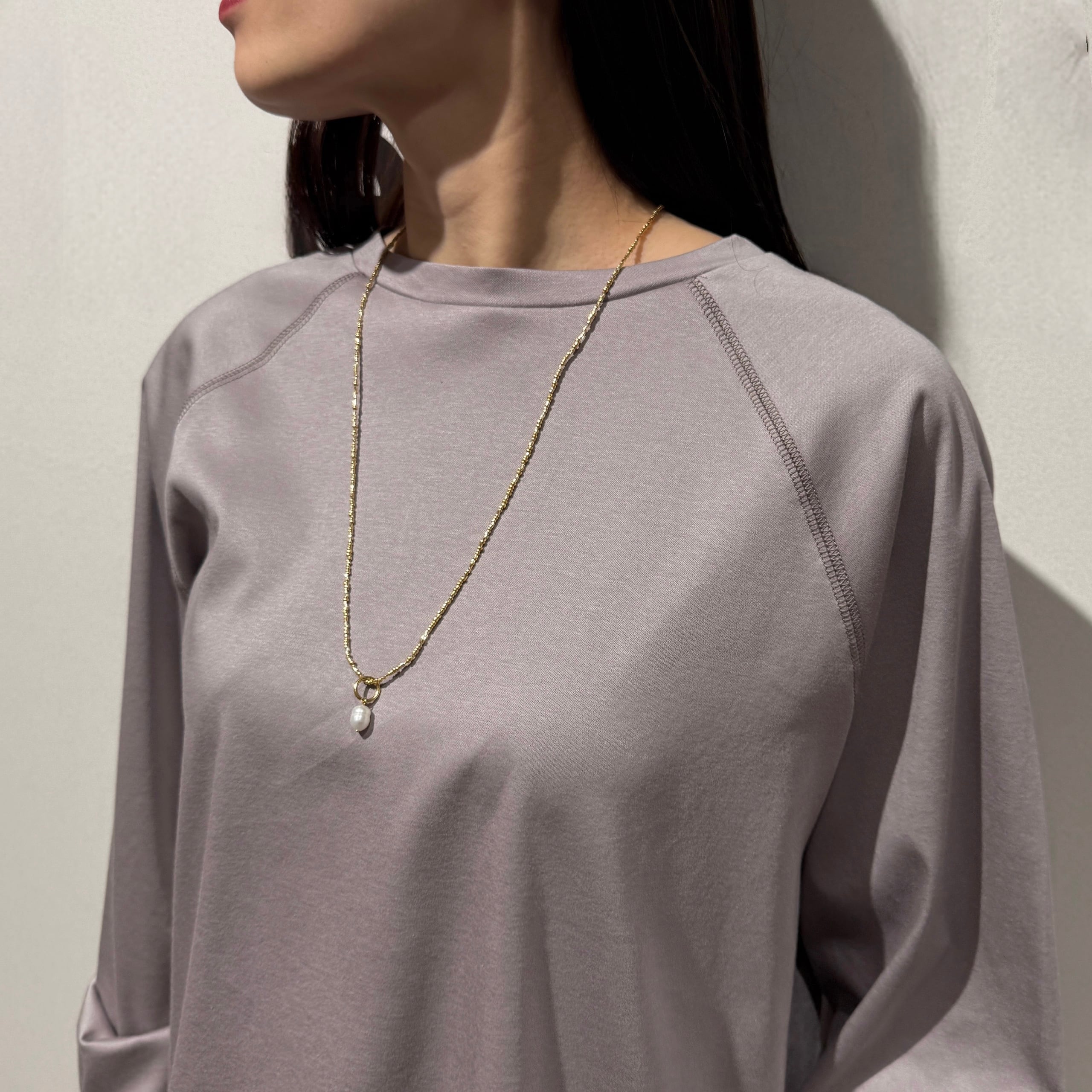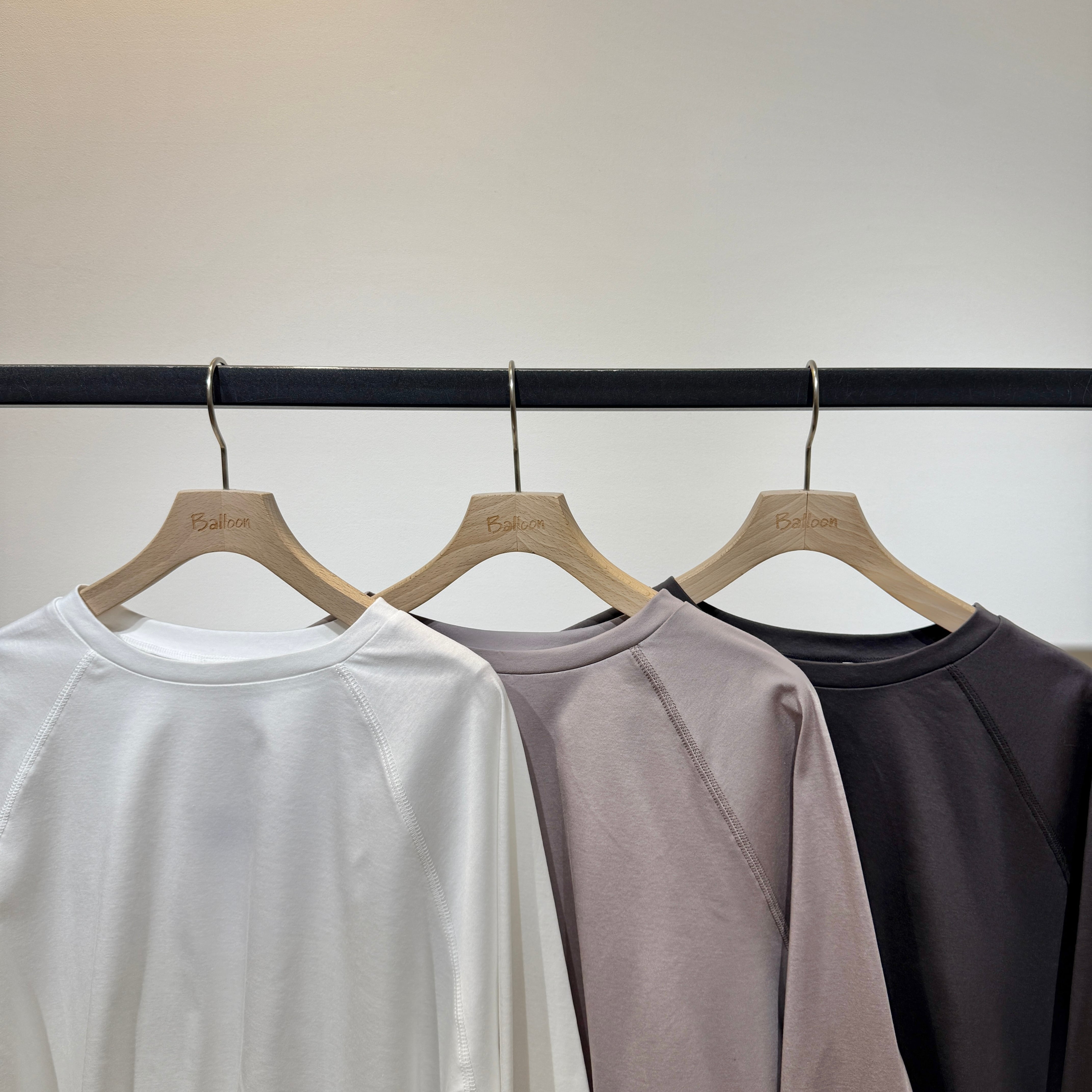 ラグランスリーブのゆったり設計に、前後差のある着丈とラウンド裾で抜け感のあるシルエット。