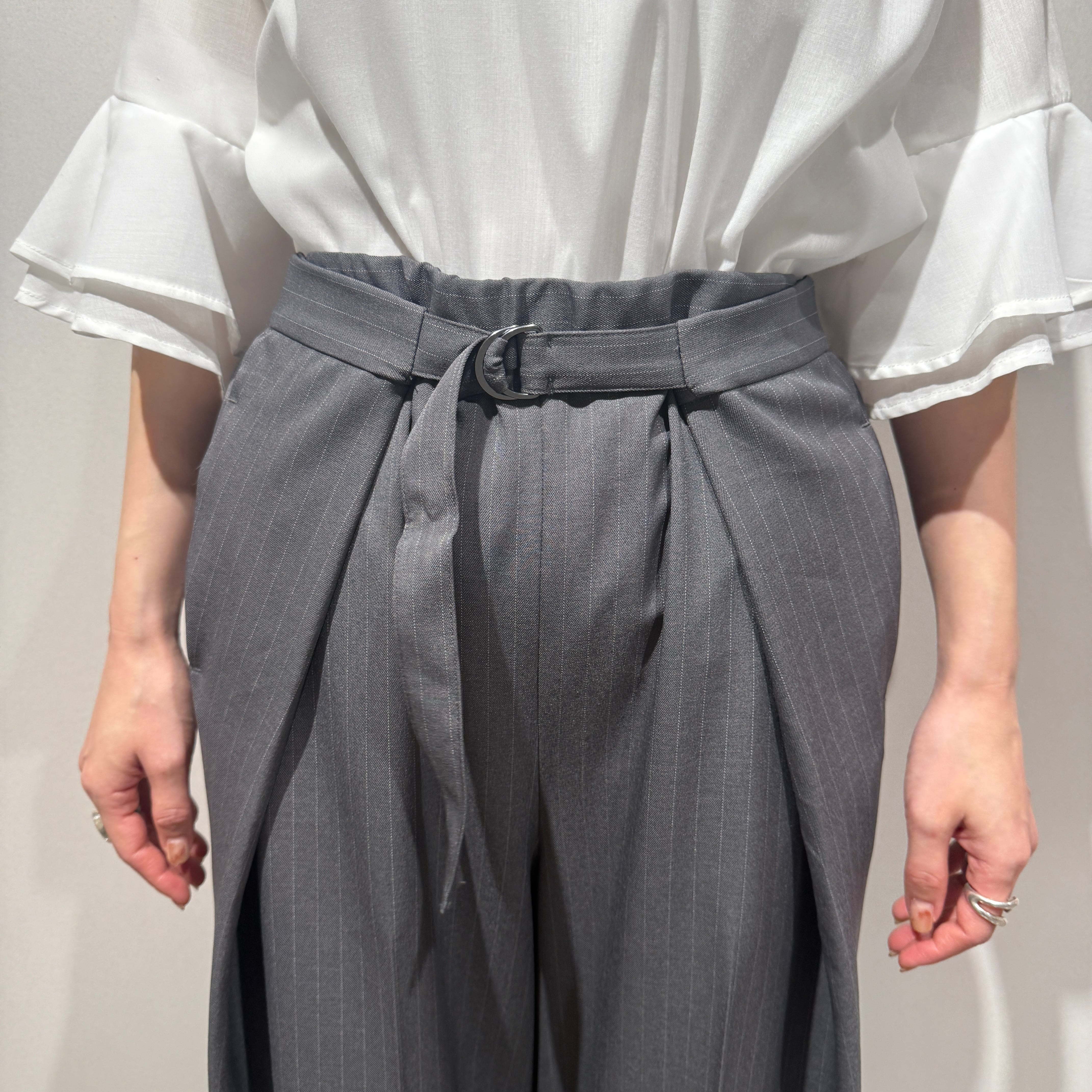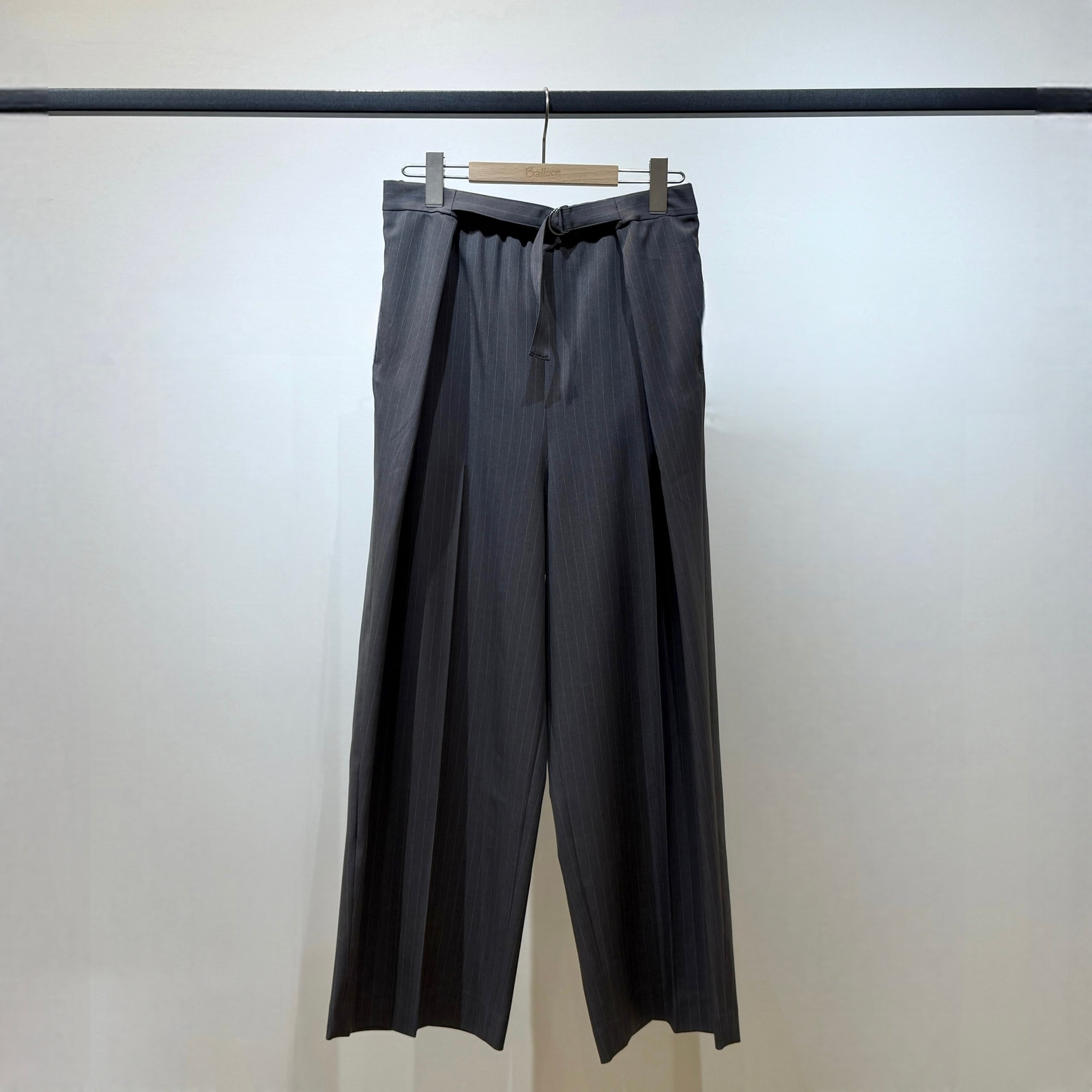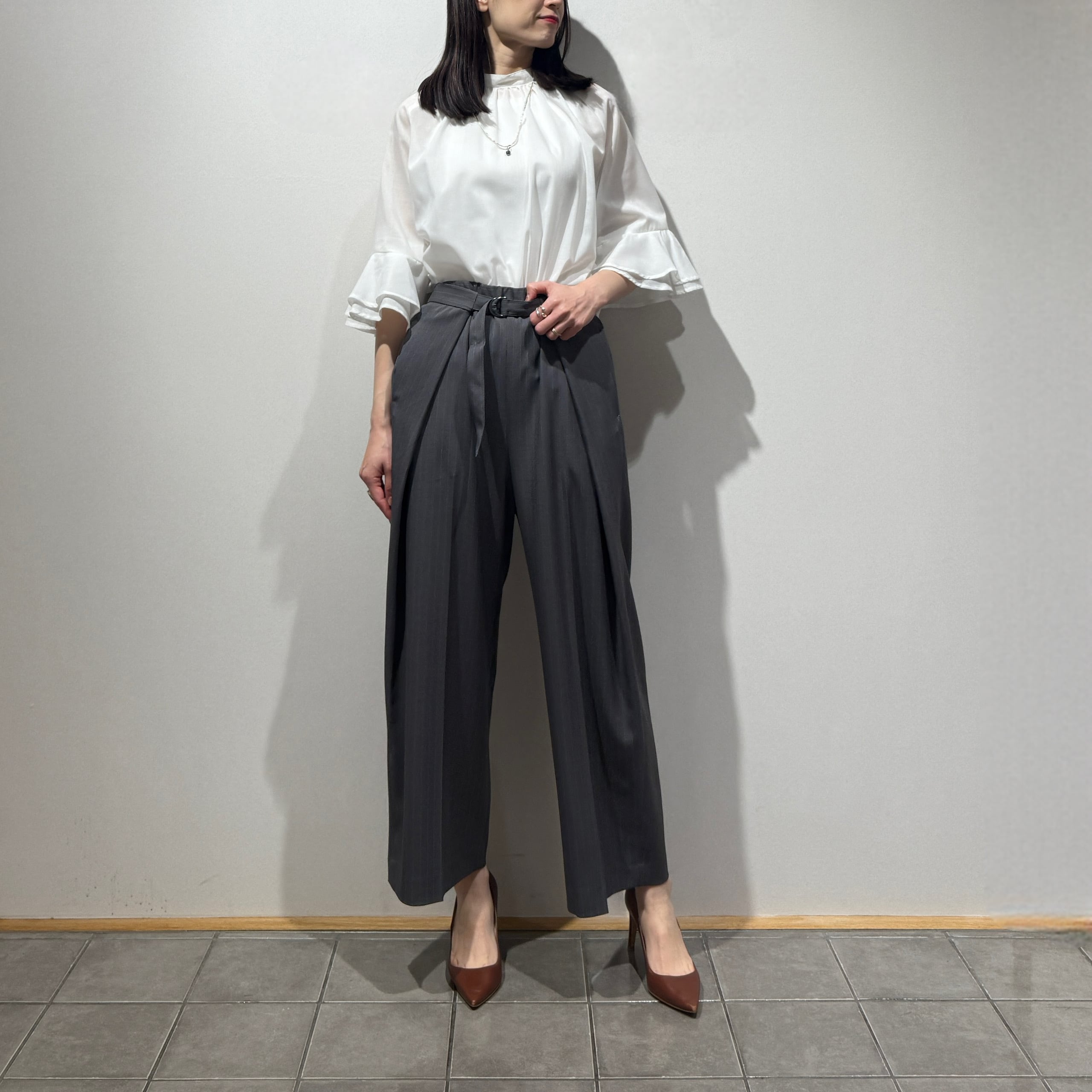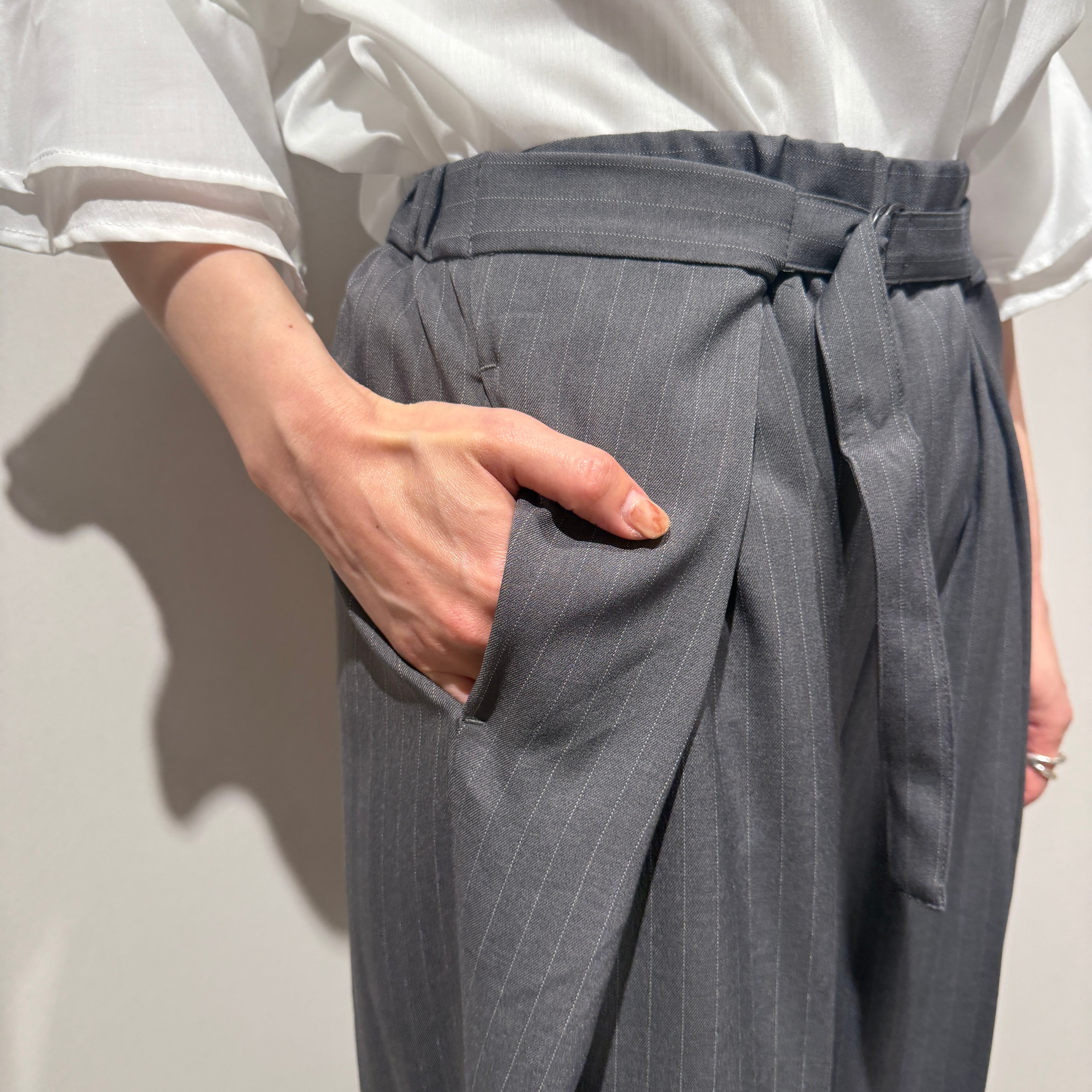 ラップ風デザインが目を引く、上品さと快適さを兼ね備えたタックパンツ。