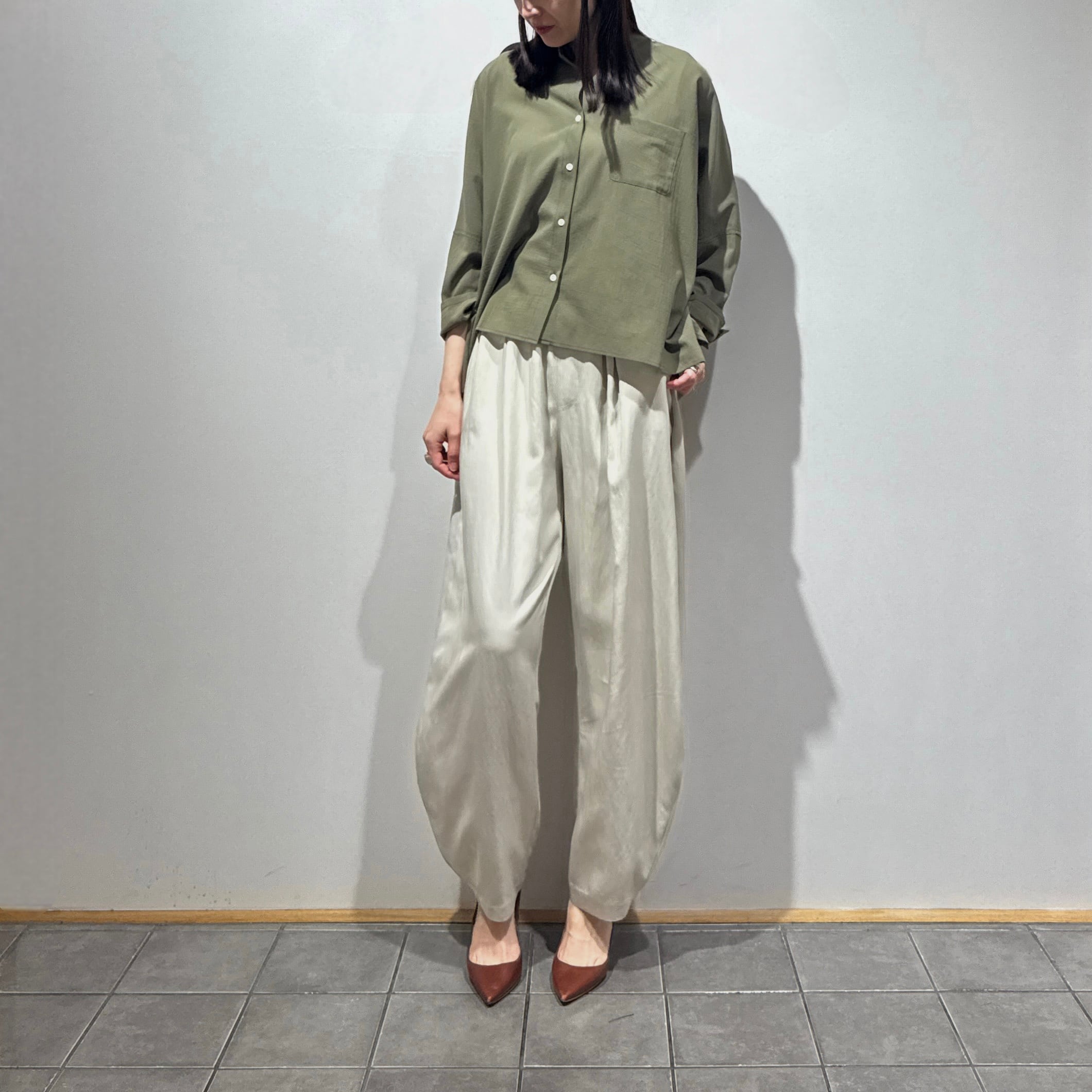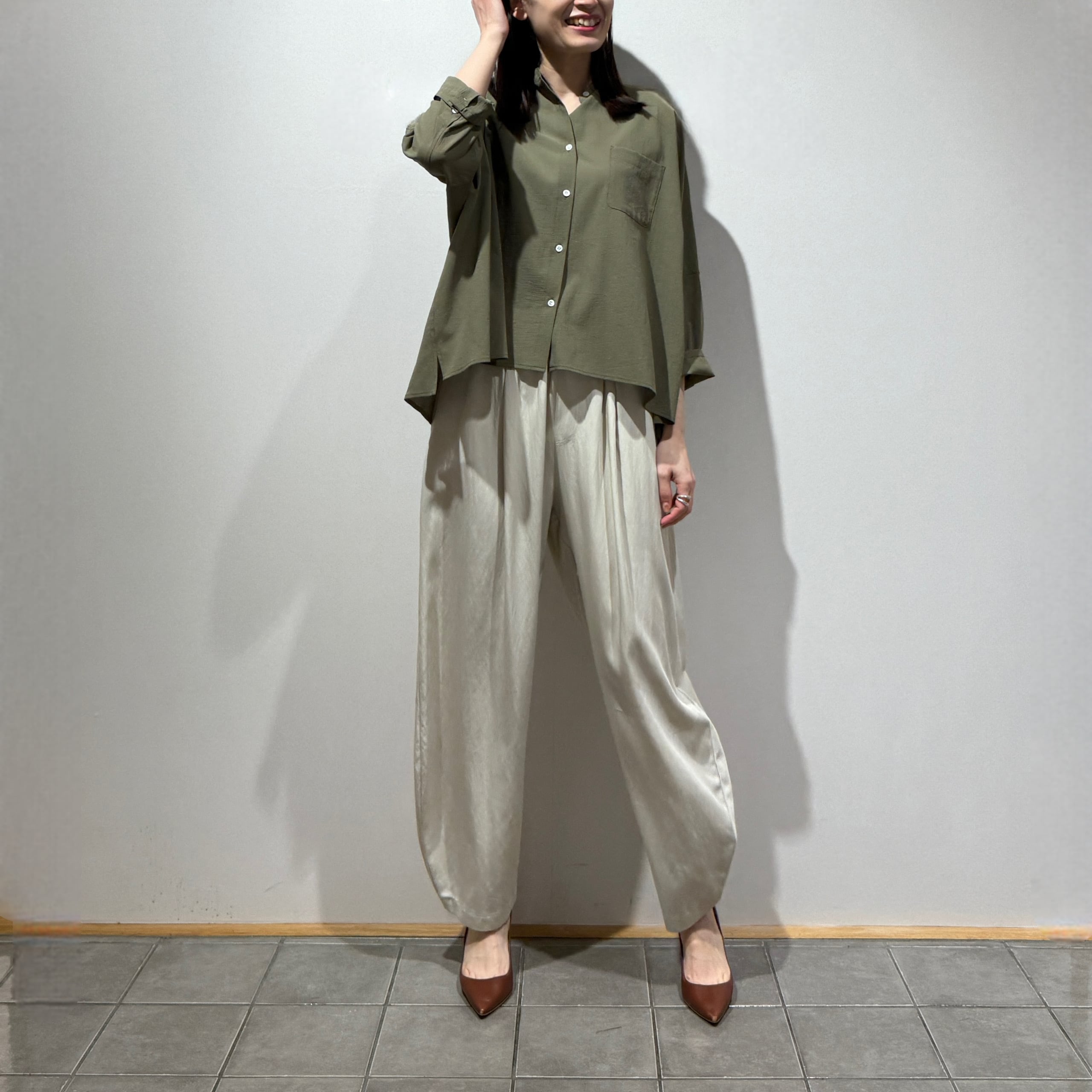 ドロップショルダー仕様で、肩のラインが落ちることでこなれた雰囲気を演出。ゆったりとしたシルエットで、ラフながらも上品な印象に仕上がっています。