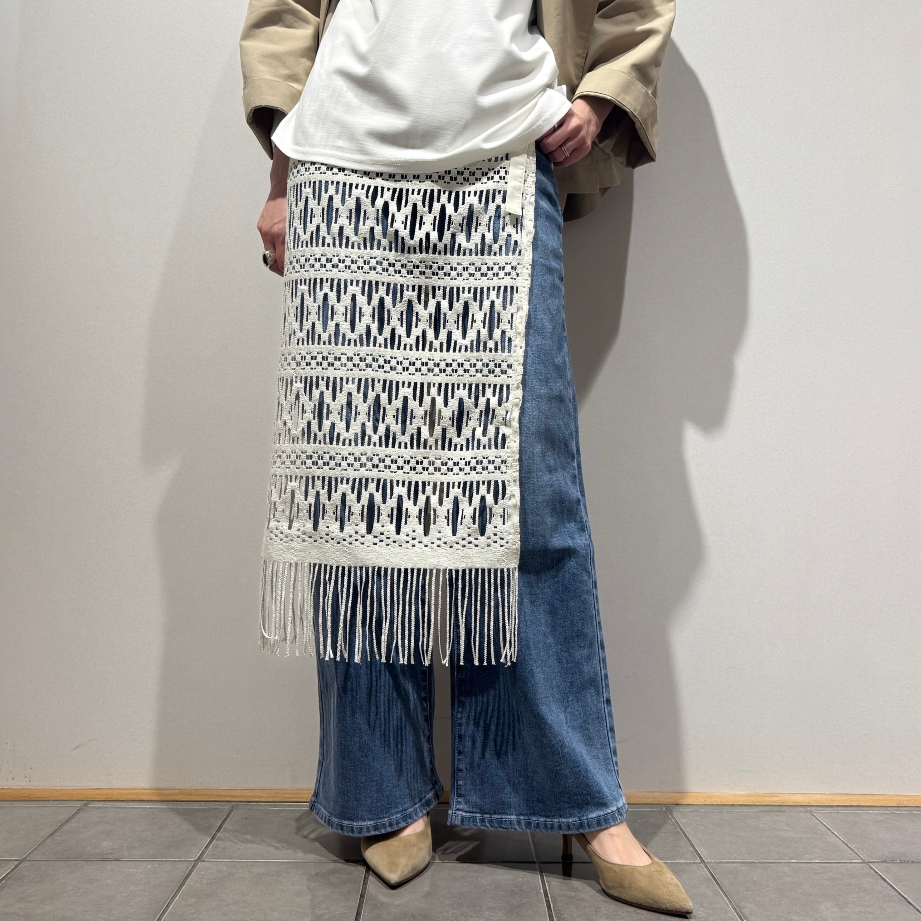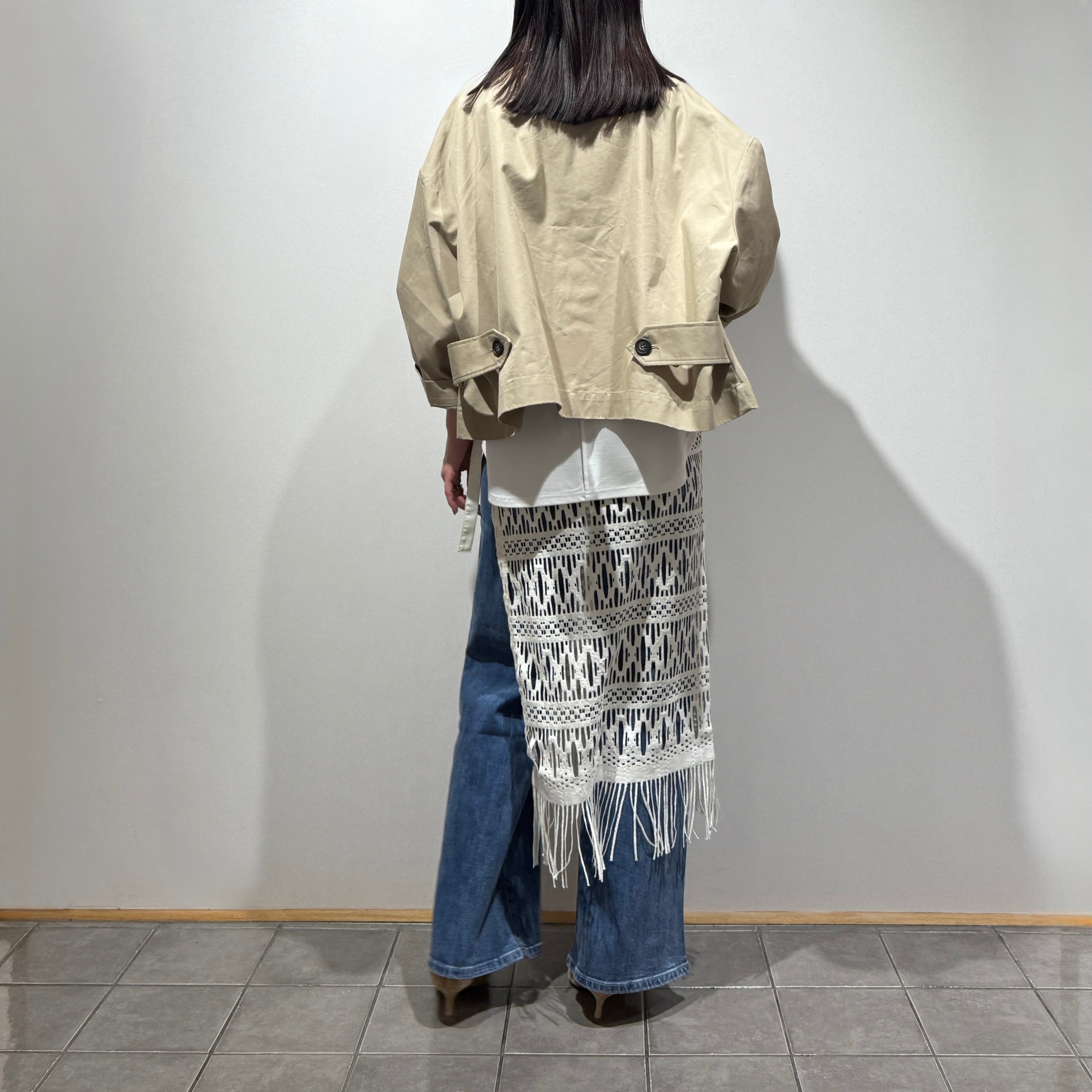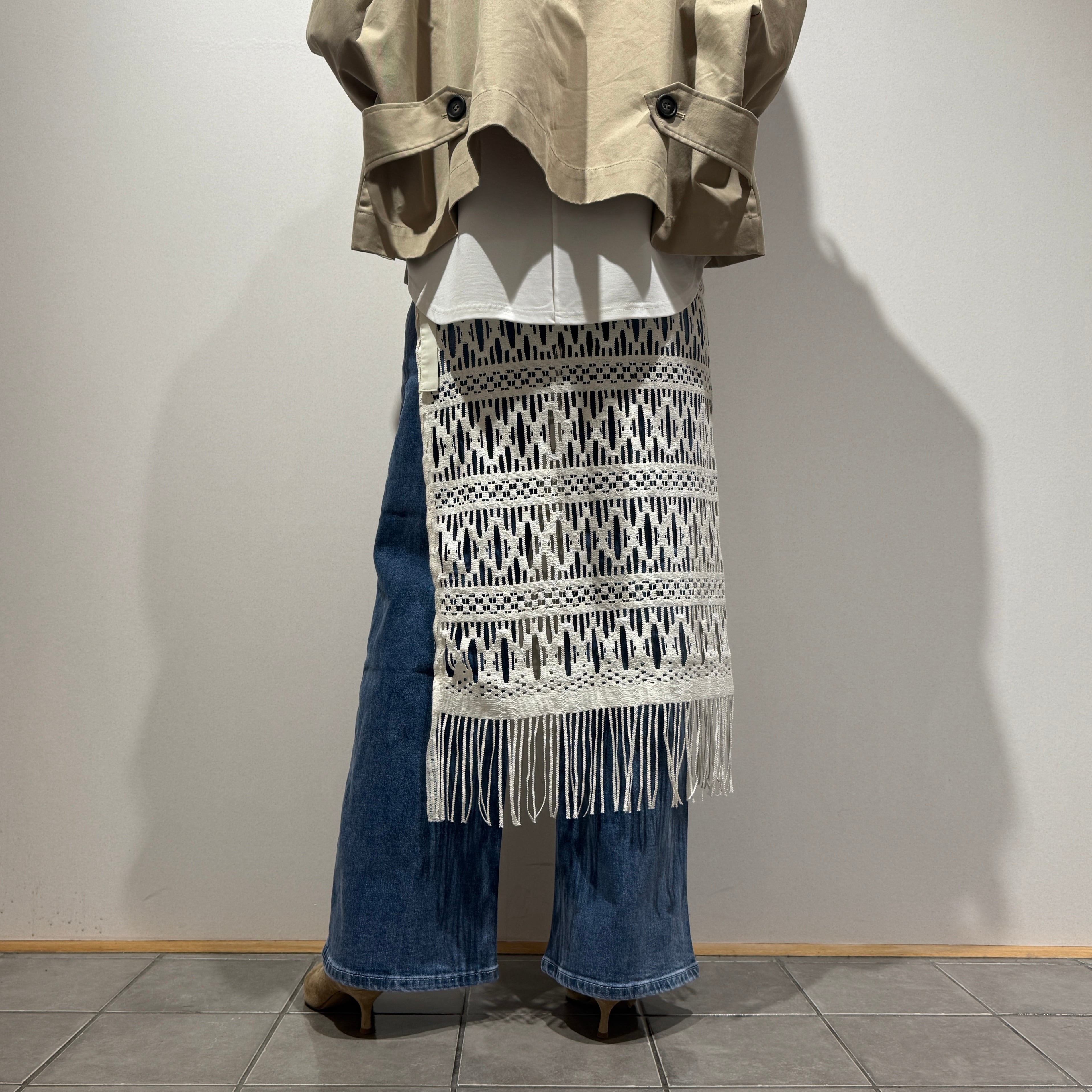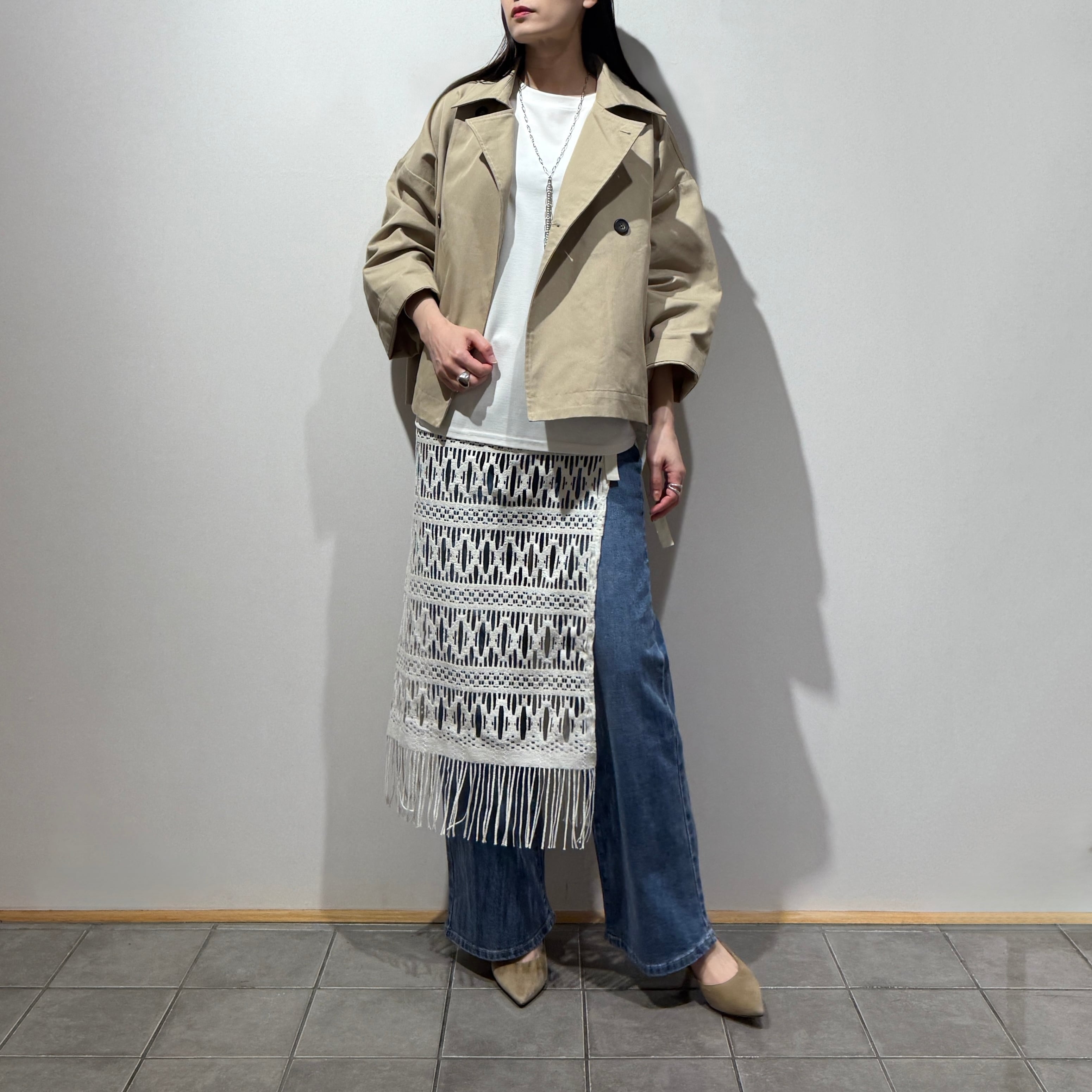 動きに合わせて裾のフリンジが軽やかに揺れ、抜け感のある大人のレイヤードスタイルを演出します。パンツ合わせはもちろん、ワンピースやタイトスカートに重ねるアレンジもおすすめです。