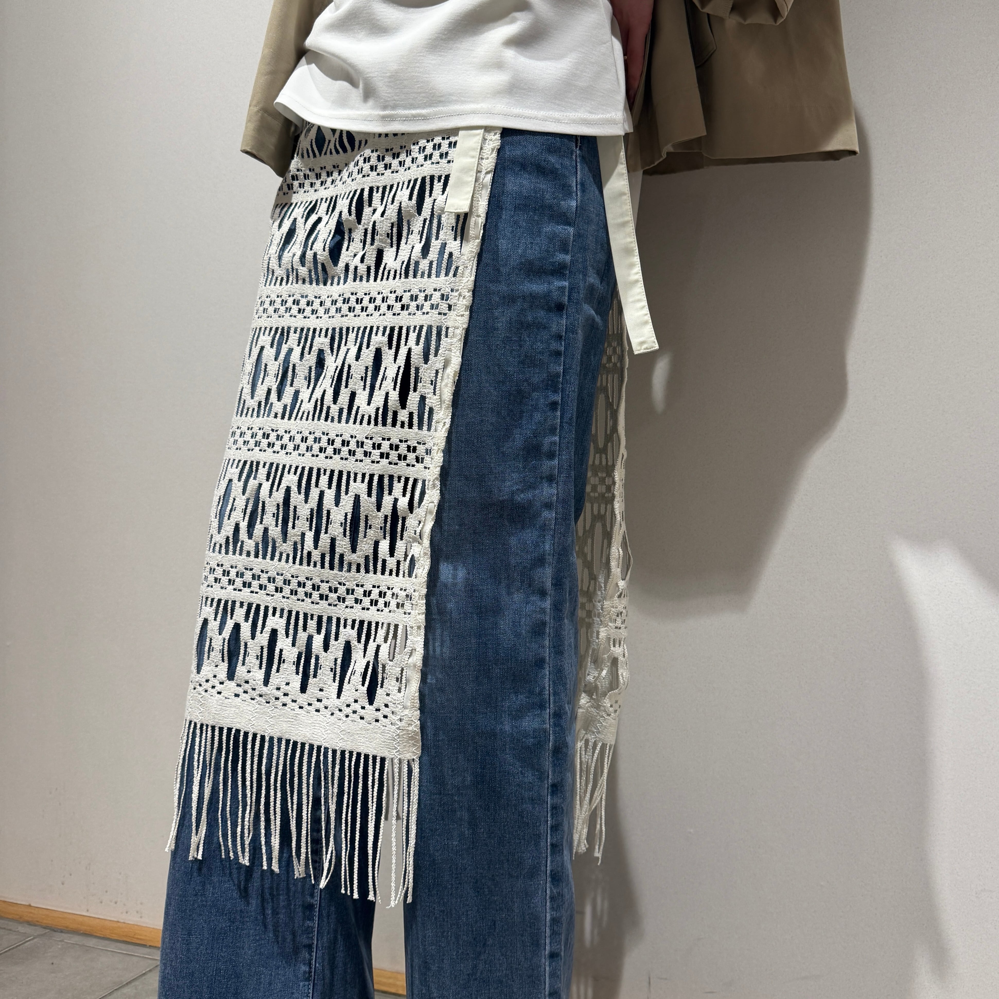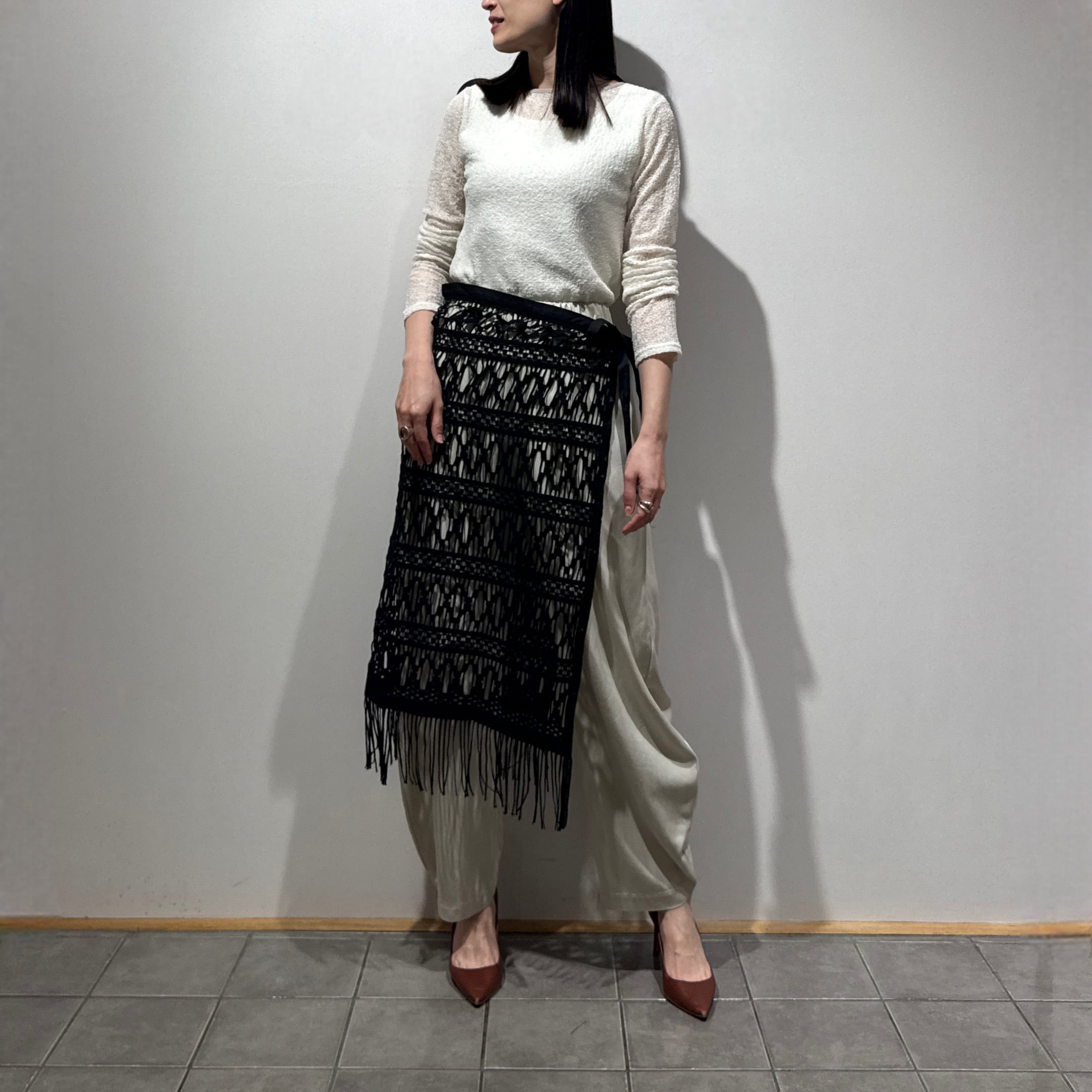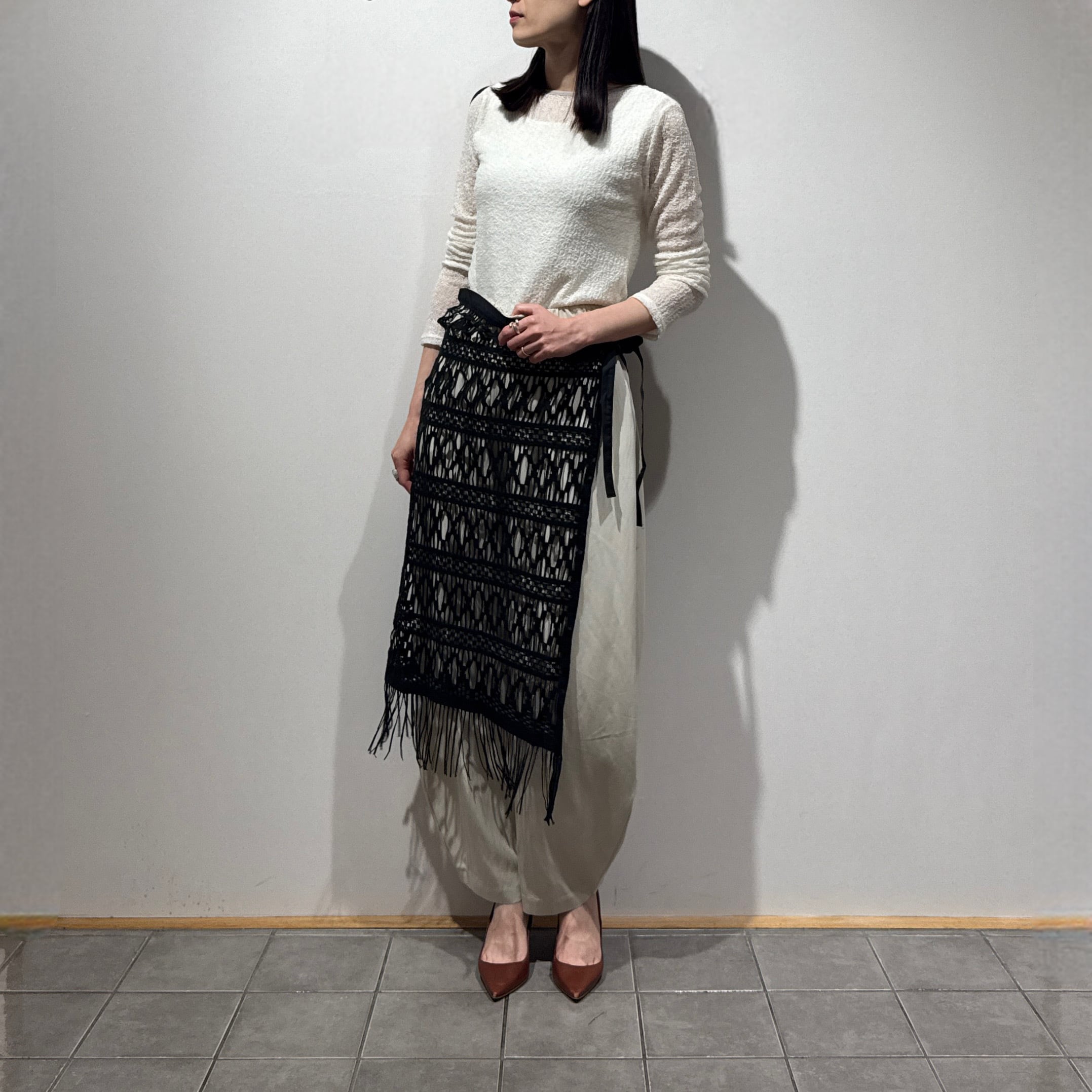 動きに合わせて裾のフリンジが軽やかに揺れ、抜け感のある大人のレイヤードスタイルを演出します。パンツ合わせはもちろん、ワンピースやタイトスカートに重ねるアレンジもおすすめです。