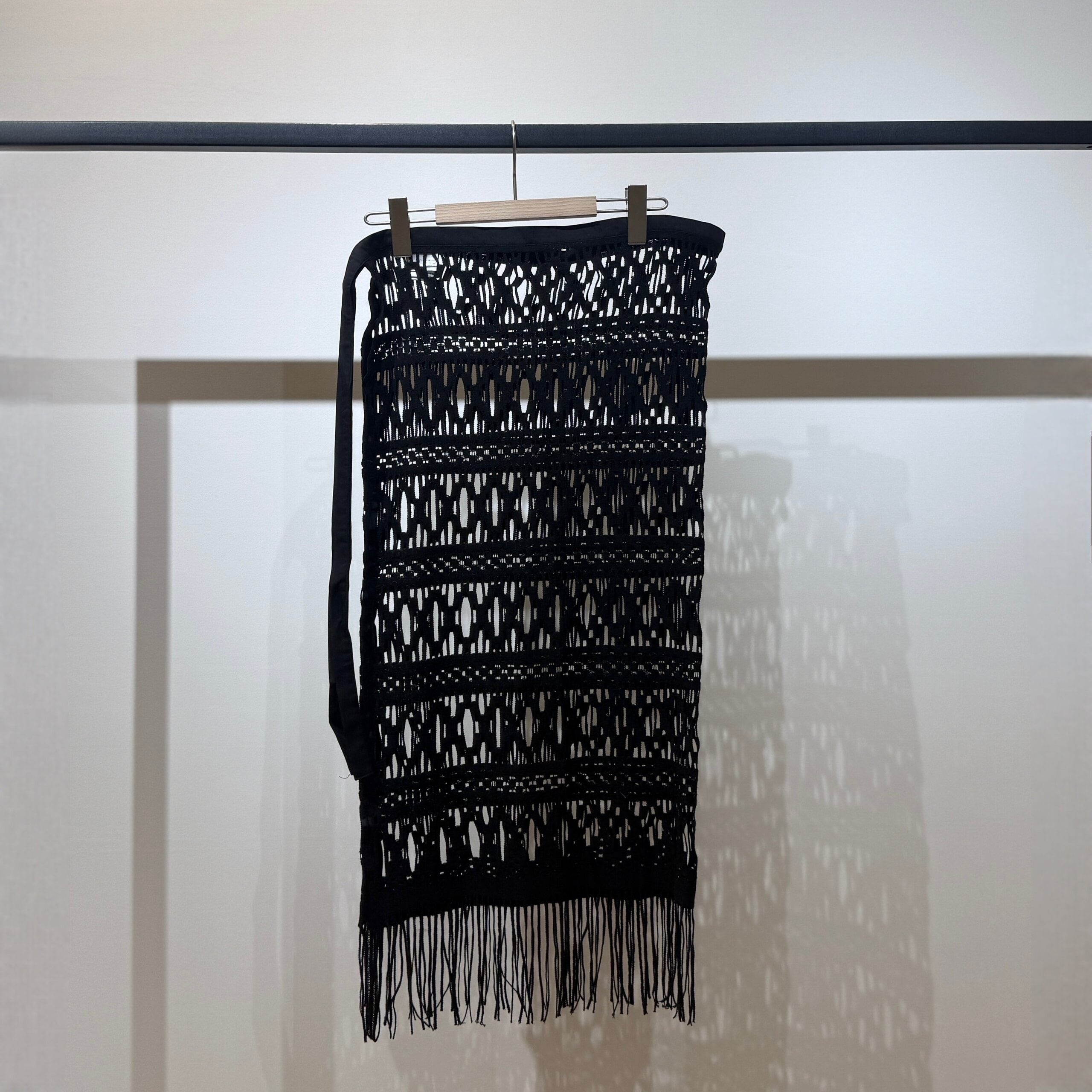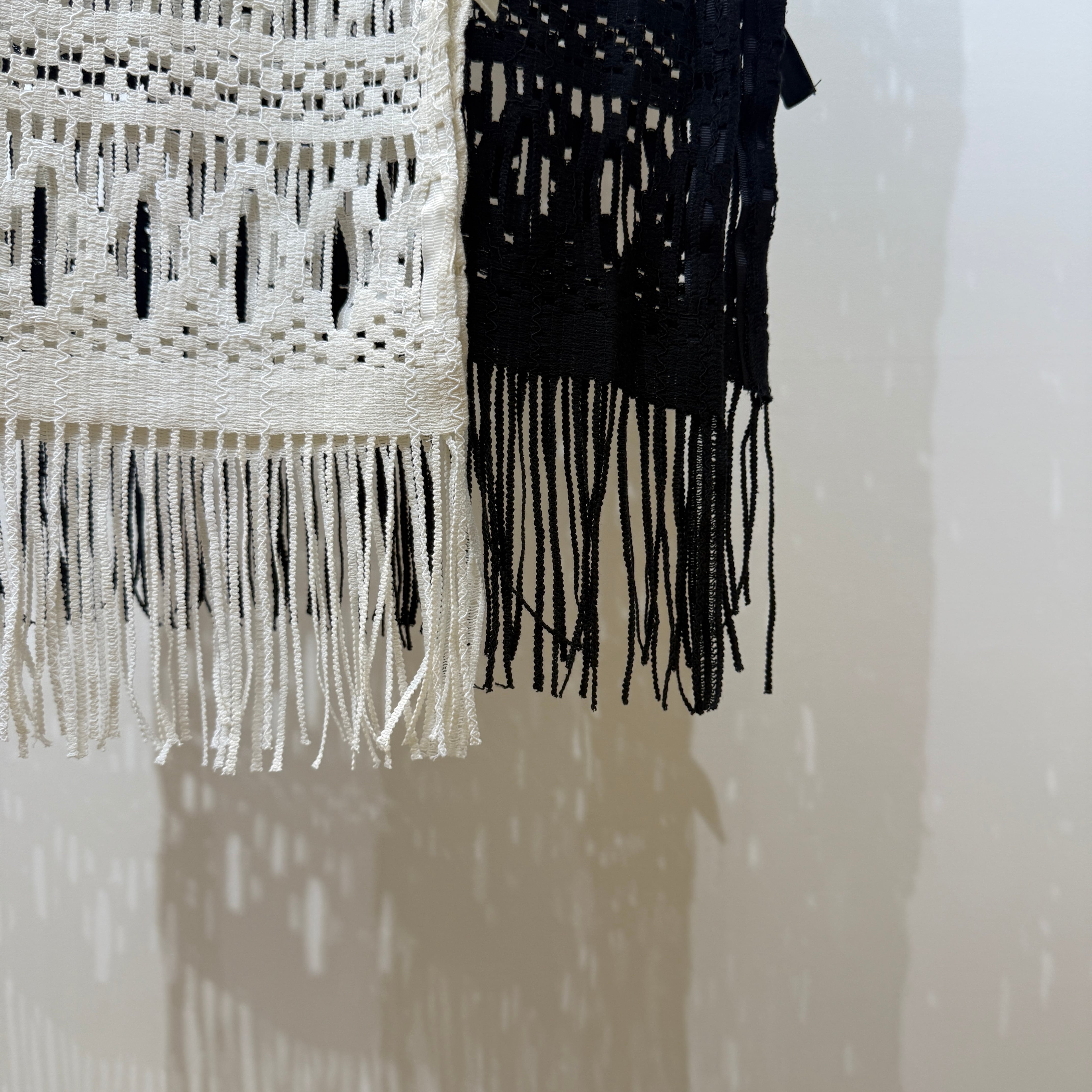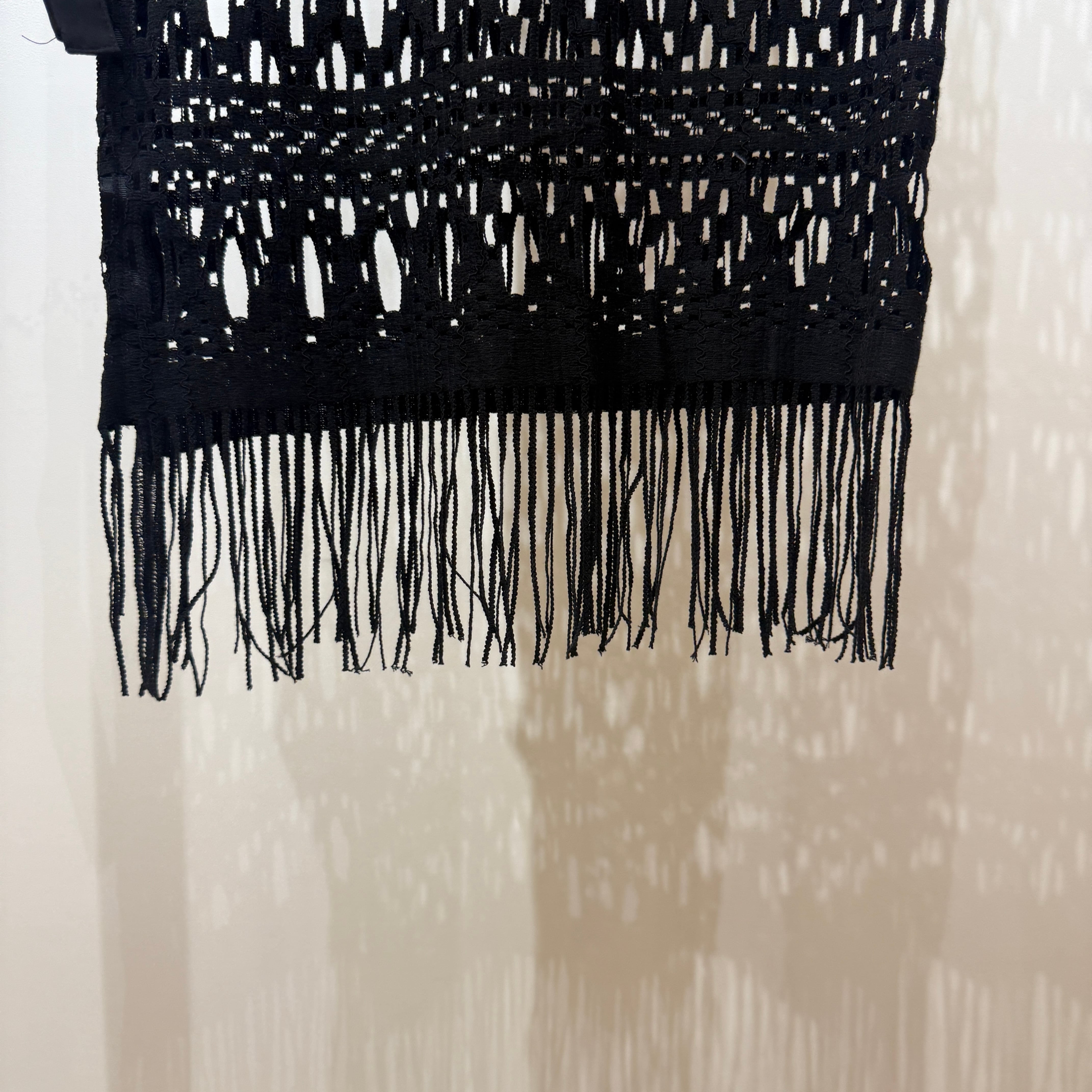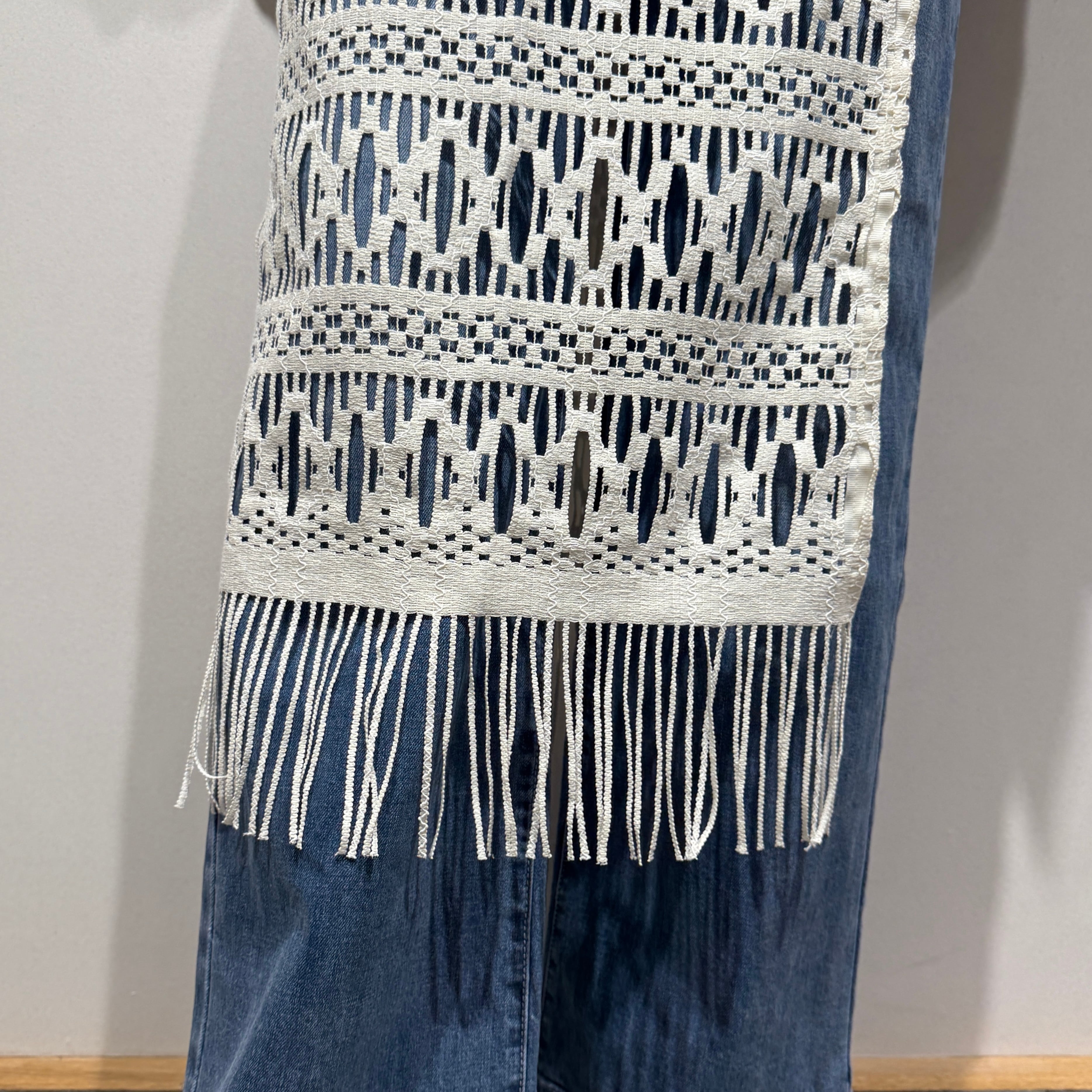 動きに合わせて裾のフリンジが軽やかに揺れ、抜け感のある大人のレイヤードスタイルを演出します。パンツ合わせはもちろん、ワンピースやタイトスカートに重ねるアレンジもおすすめです。