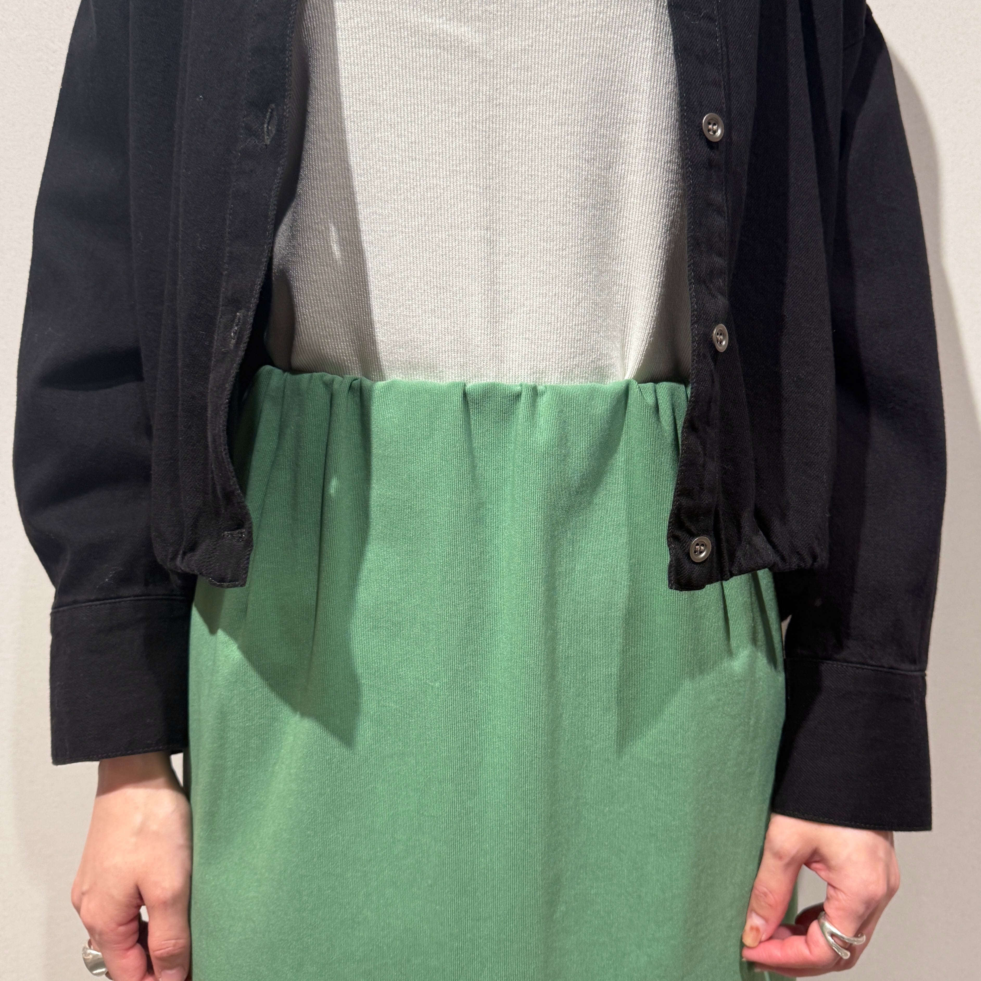 しなやかで柔らかく、高い伸縮性と通気性を持つトリコットリブ素材で、程よい肉感があり身体のラインを拾いにくい仕上がりです。