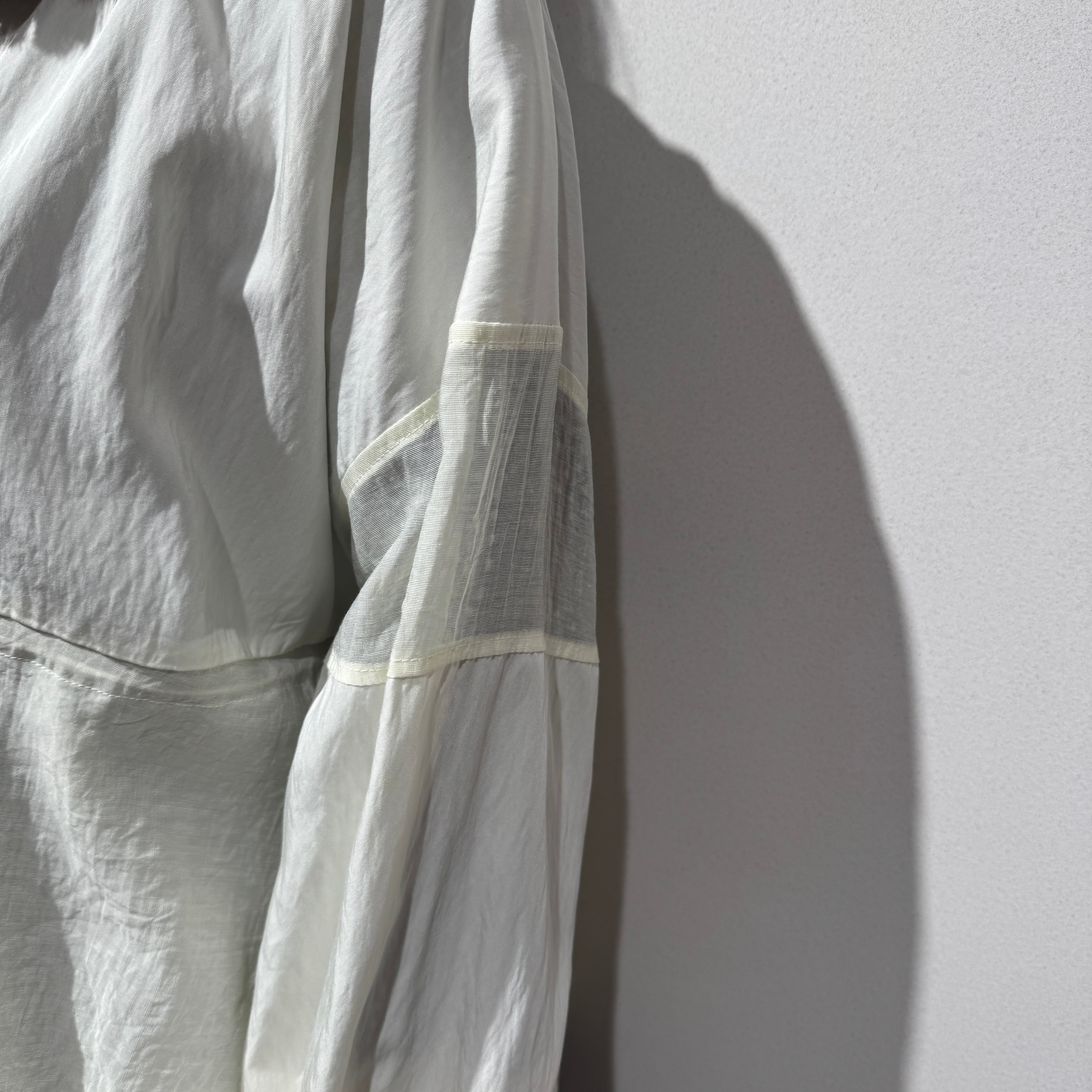 透け感を抑えた柔らかな素材とシアー素材を組み合わせ、さらりとした肌触りと奥行きのある表情に。