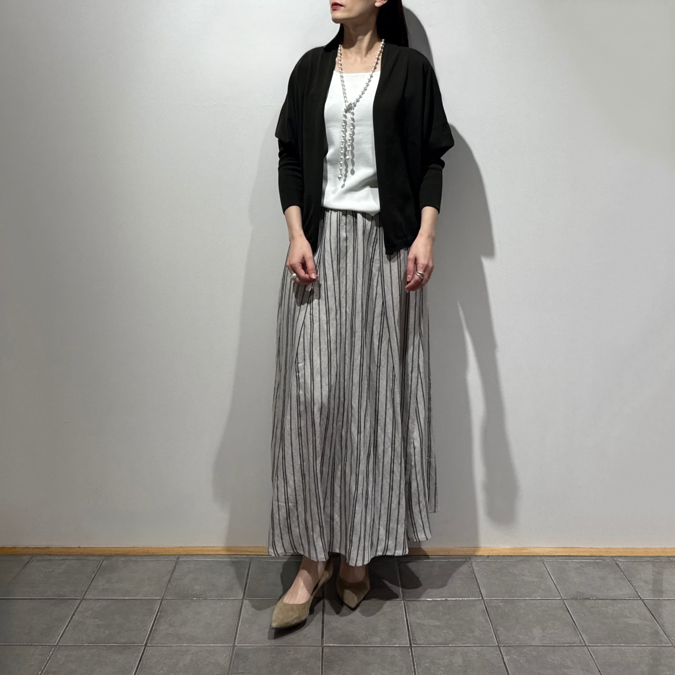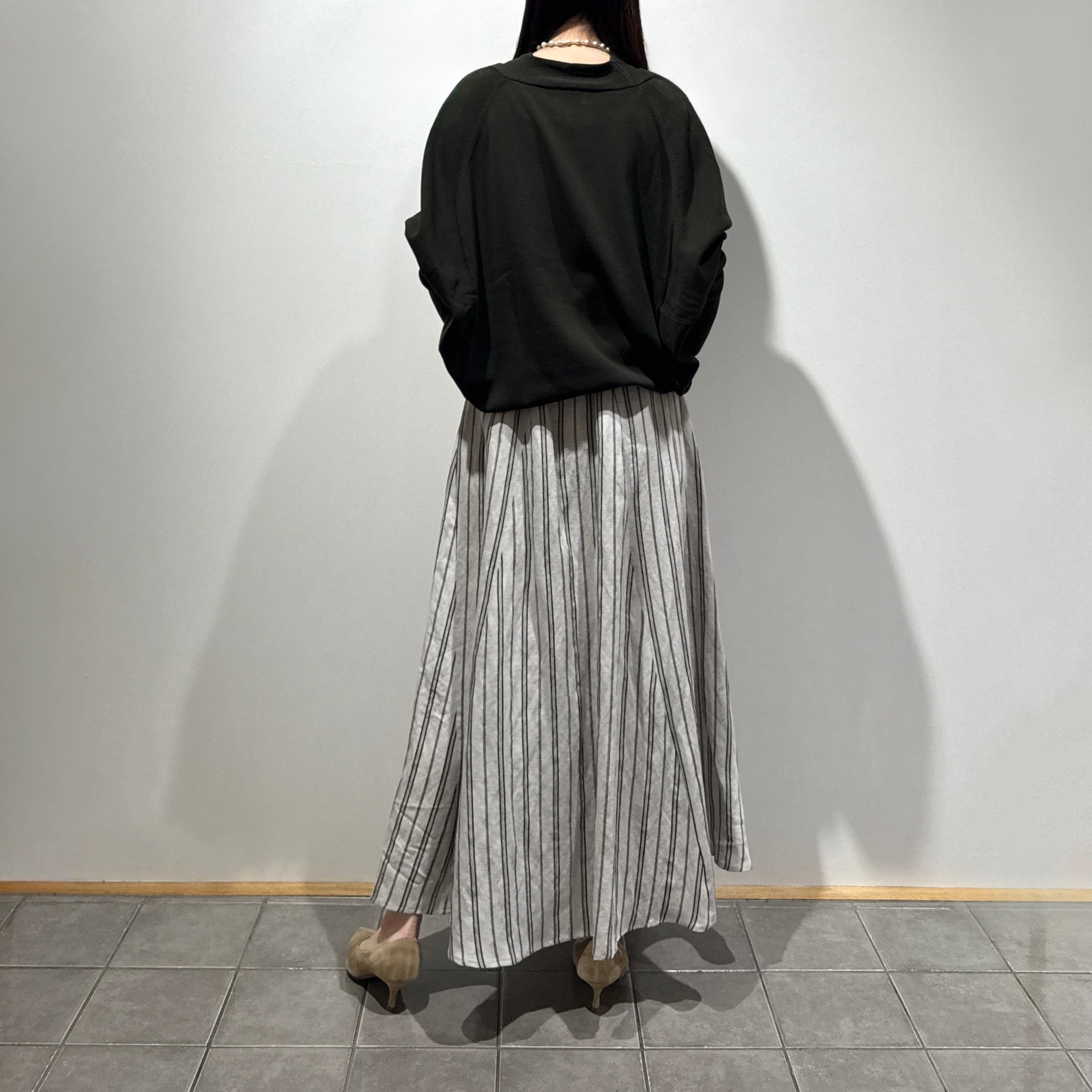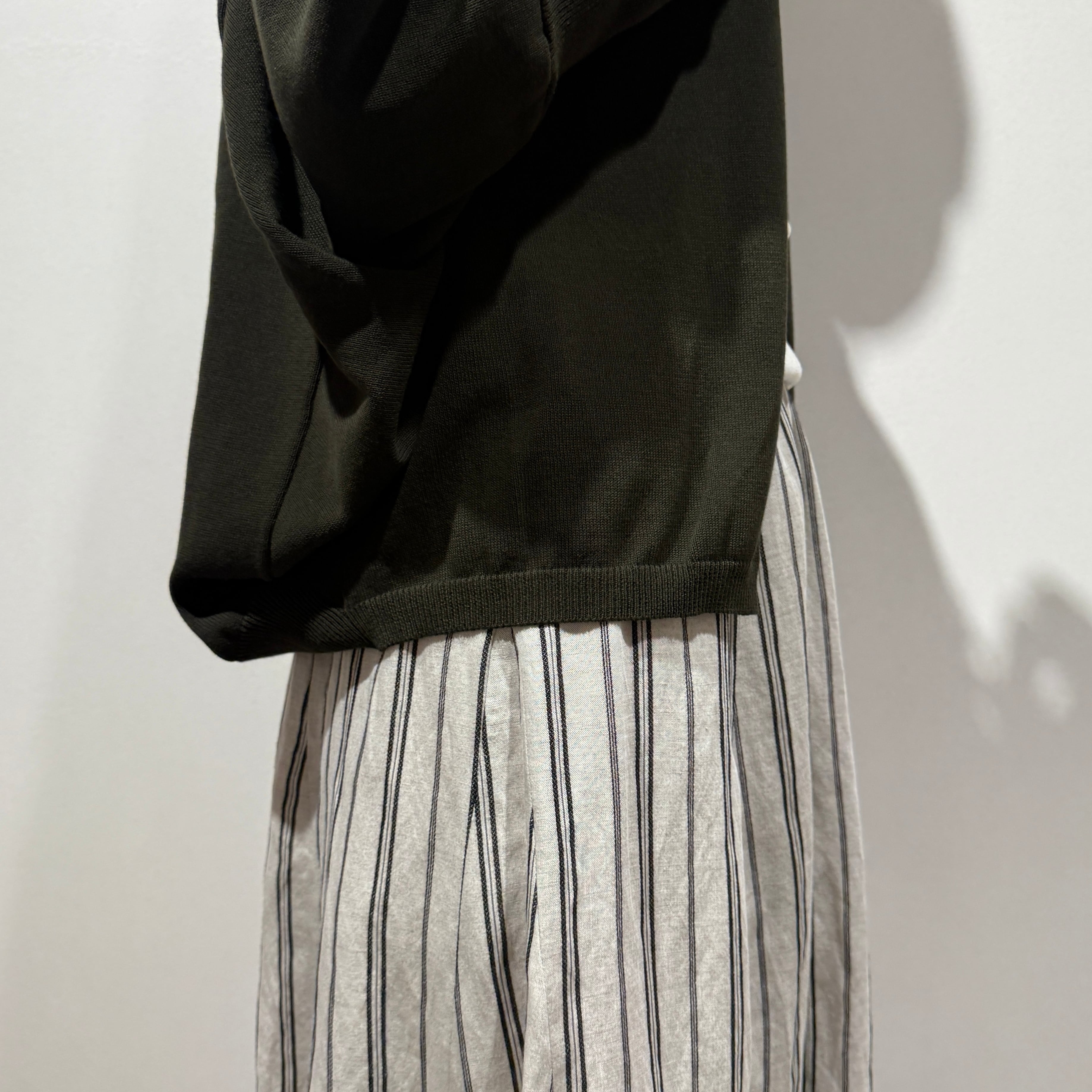 ゆったりとした身幅にほどよい裾巾でバランスを取り、すっきりとしたリブ編みのお袖が全体を引き締める、抜け感のあるシルエットに仕上げました。