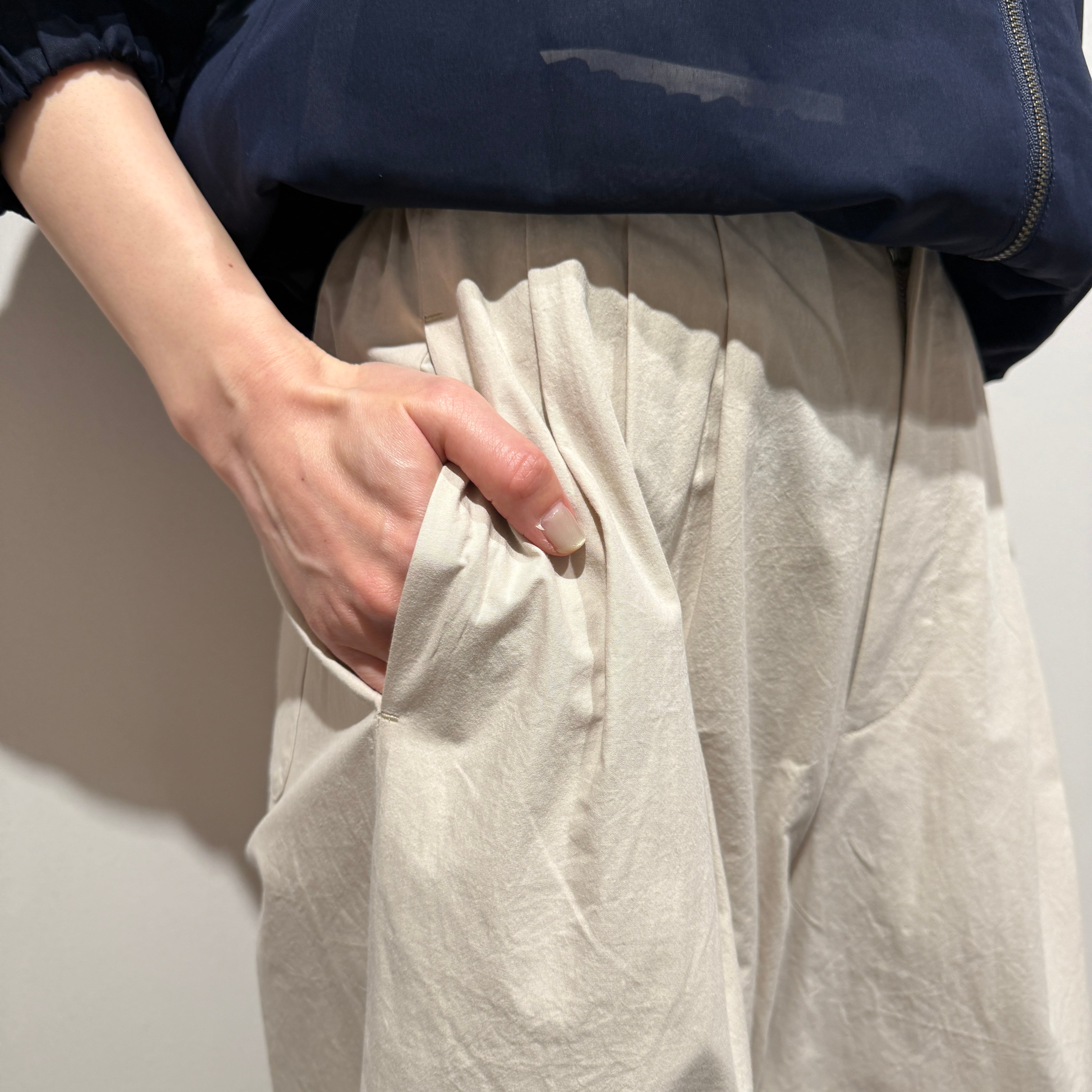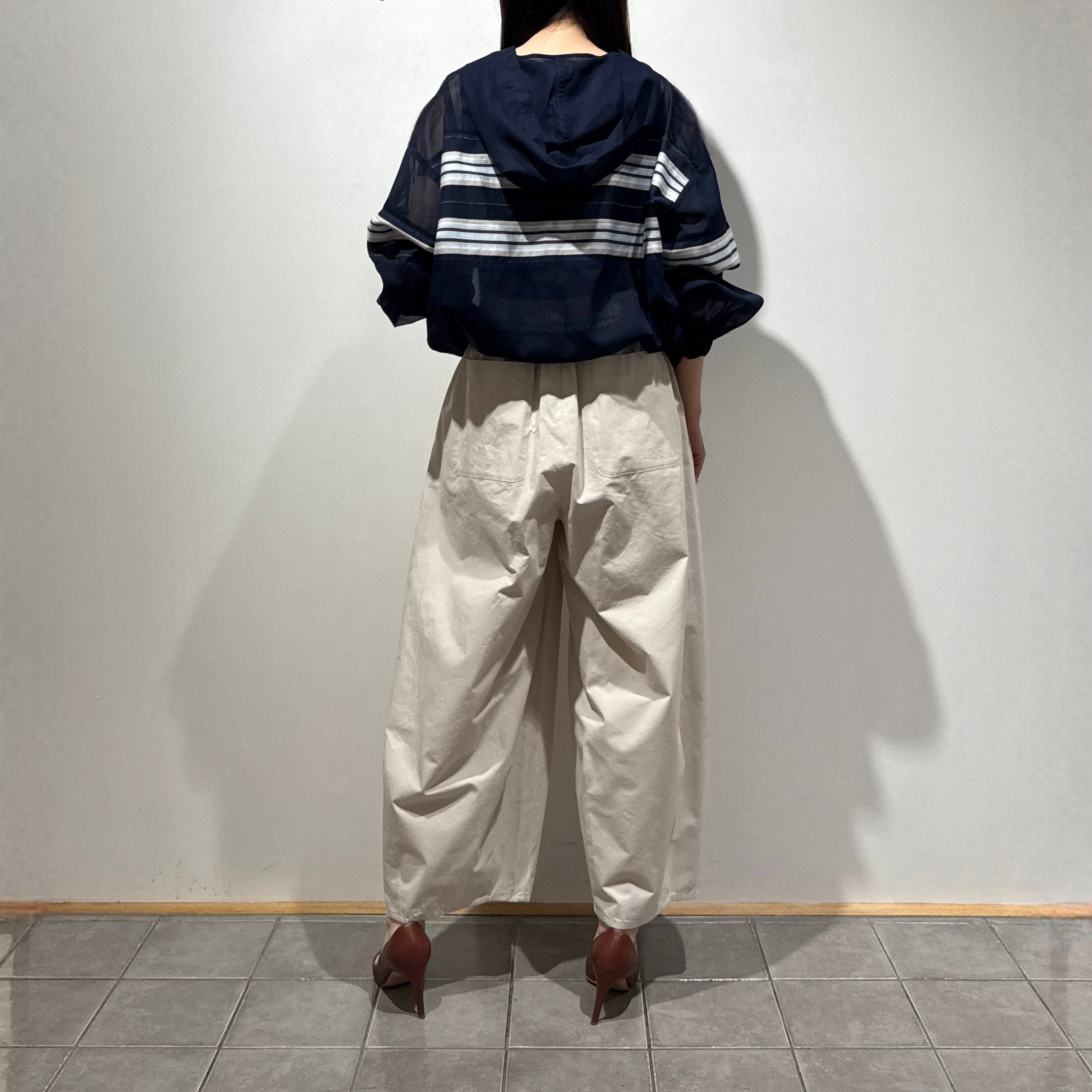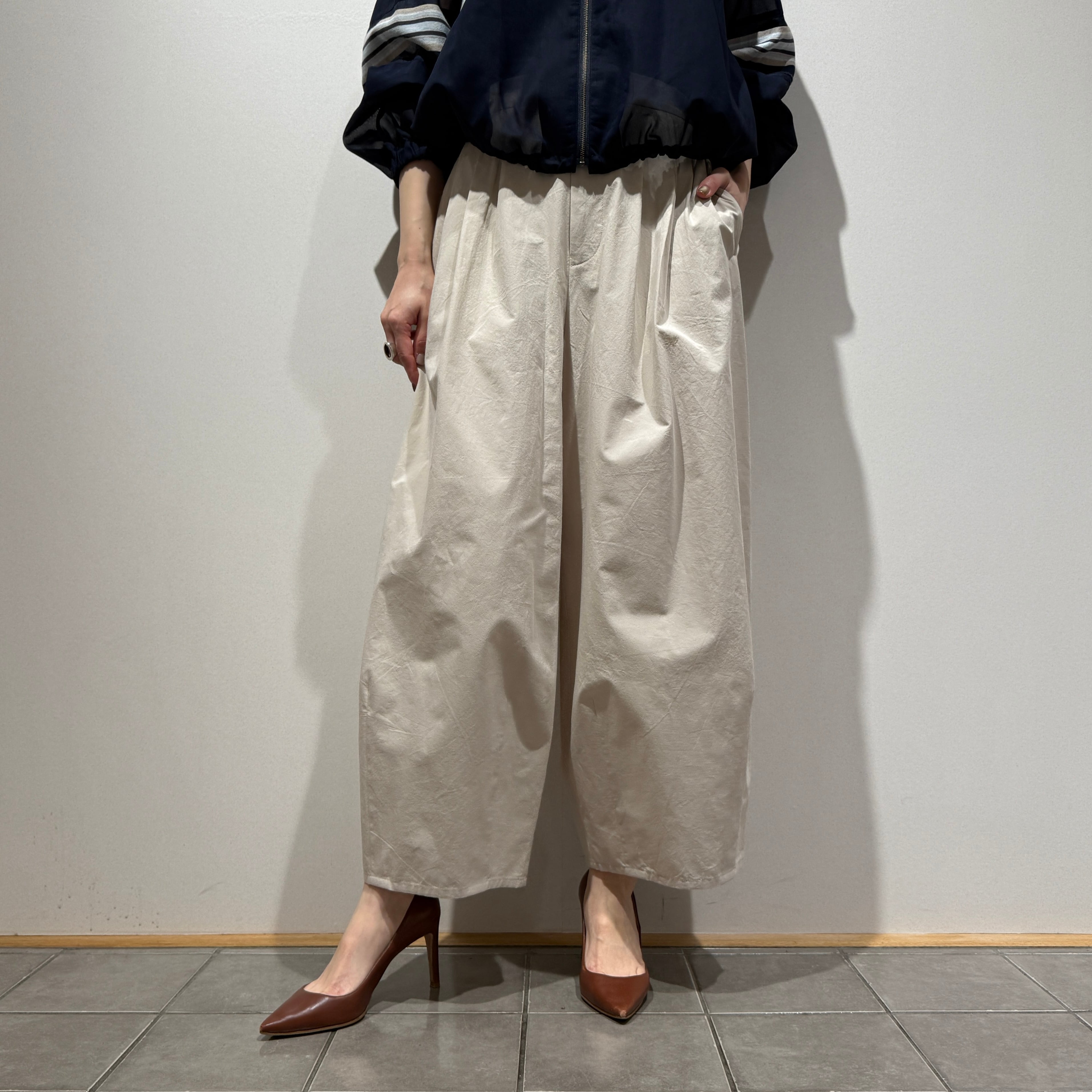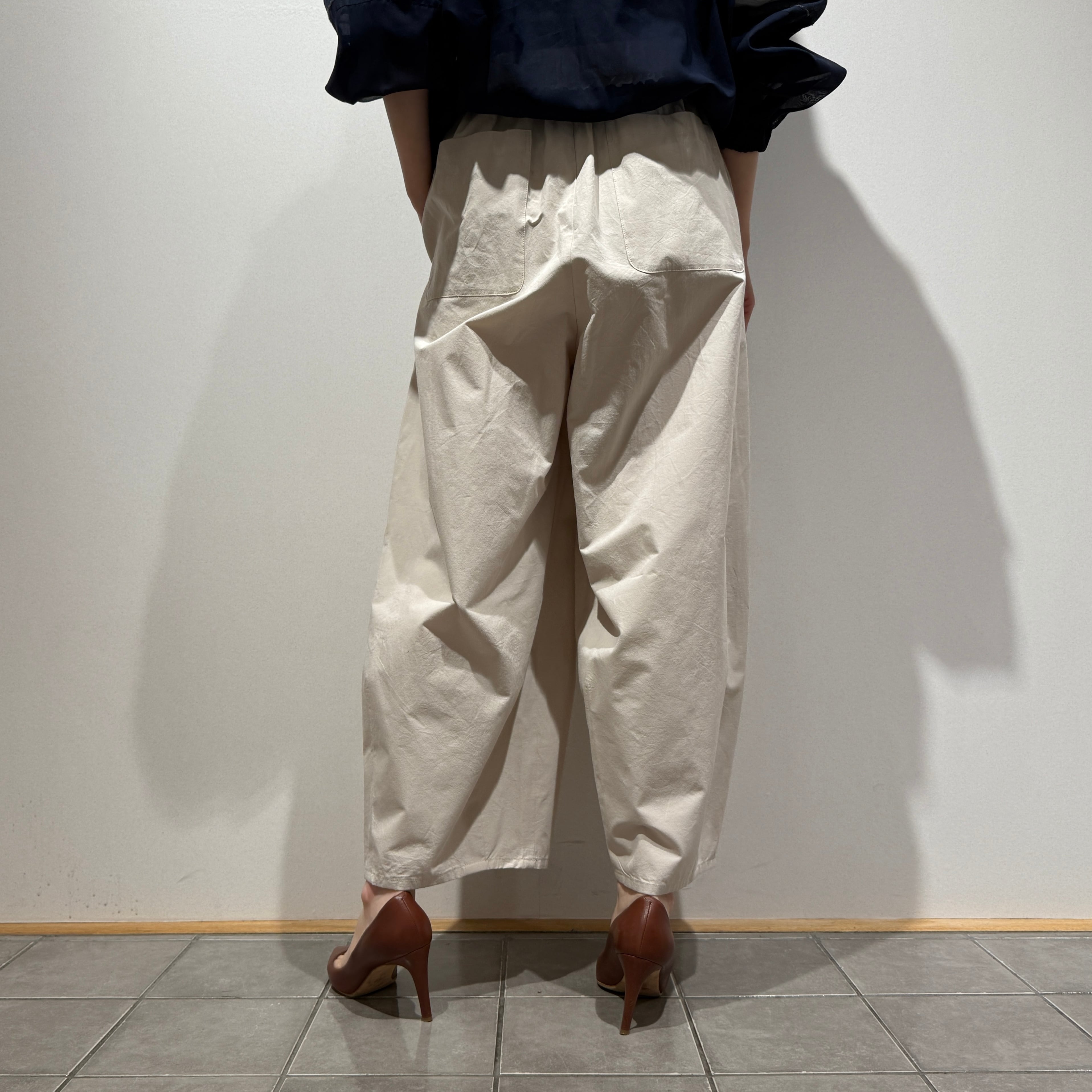 深めの股上とゆとりのある腰回りに、ややコクーンの立体シルエットで抜け感のある印象に。
