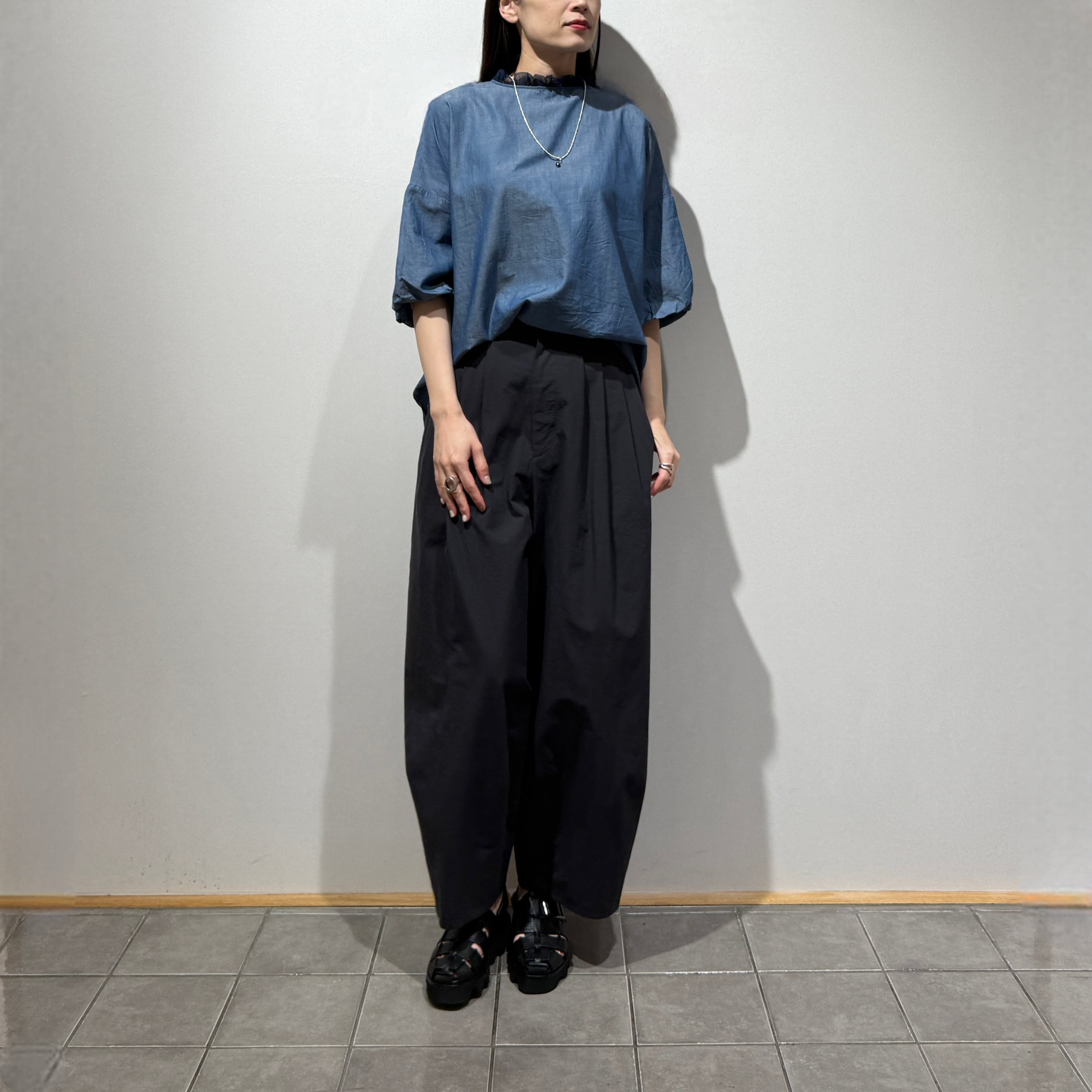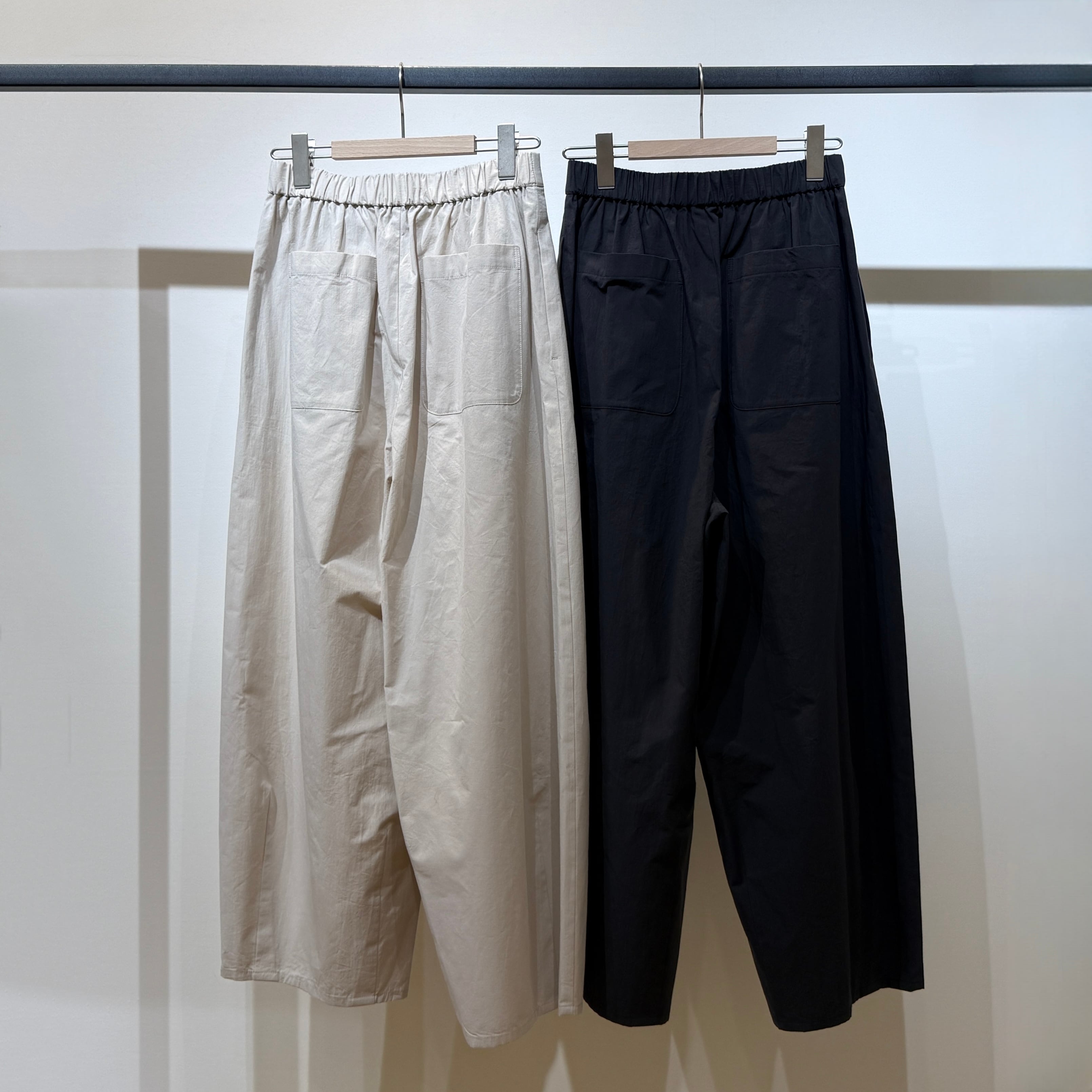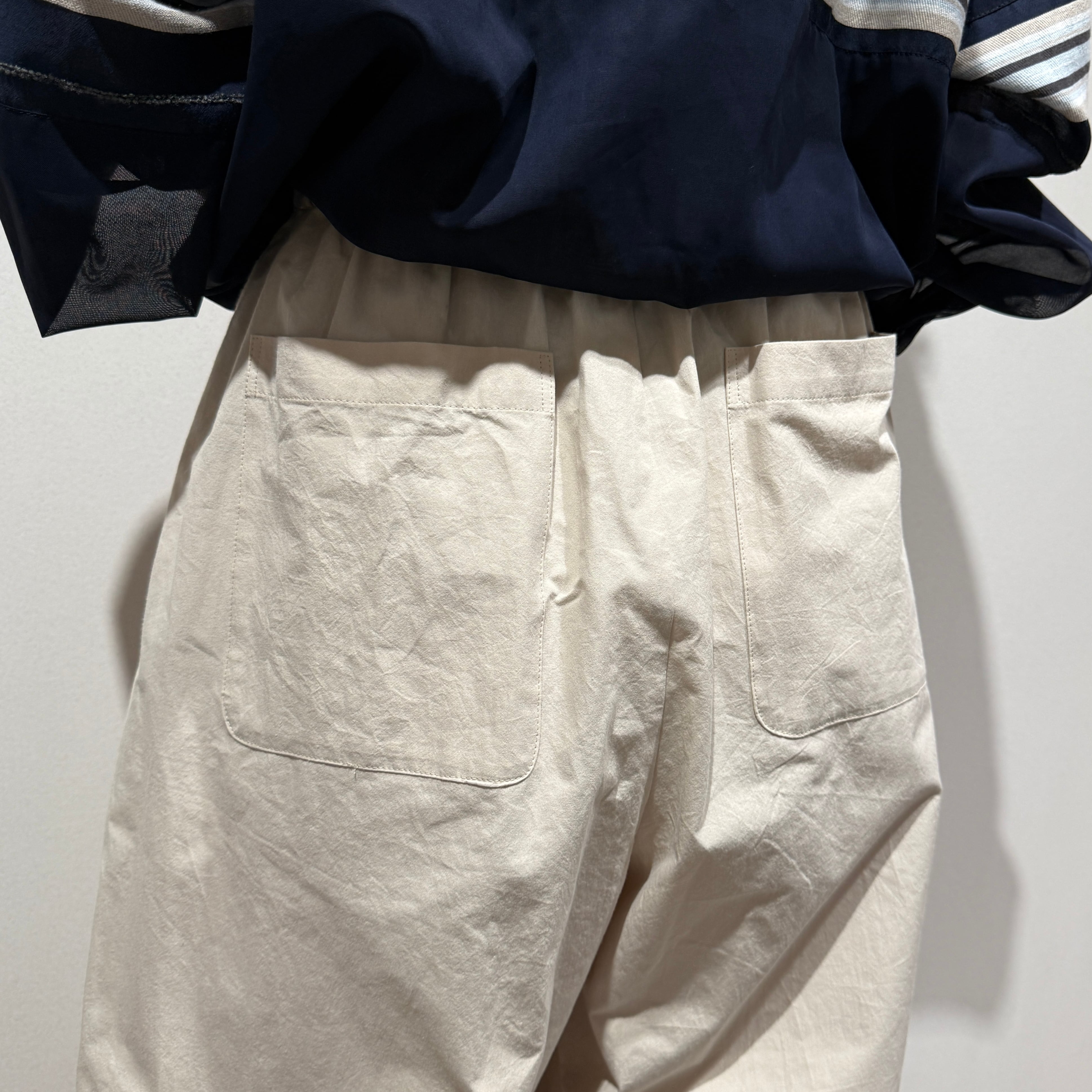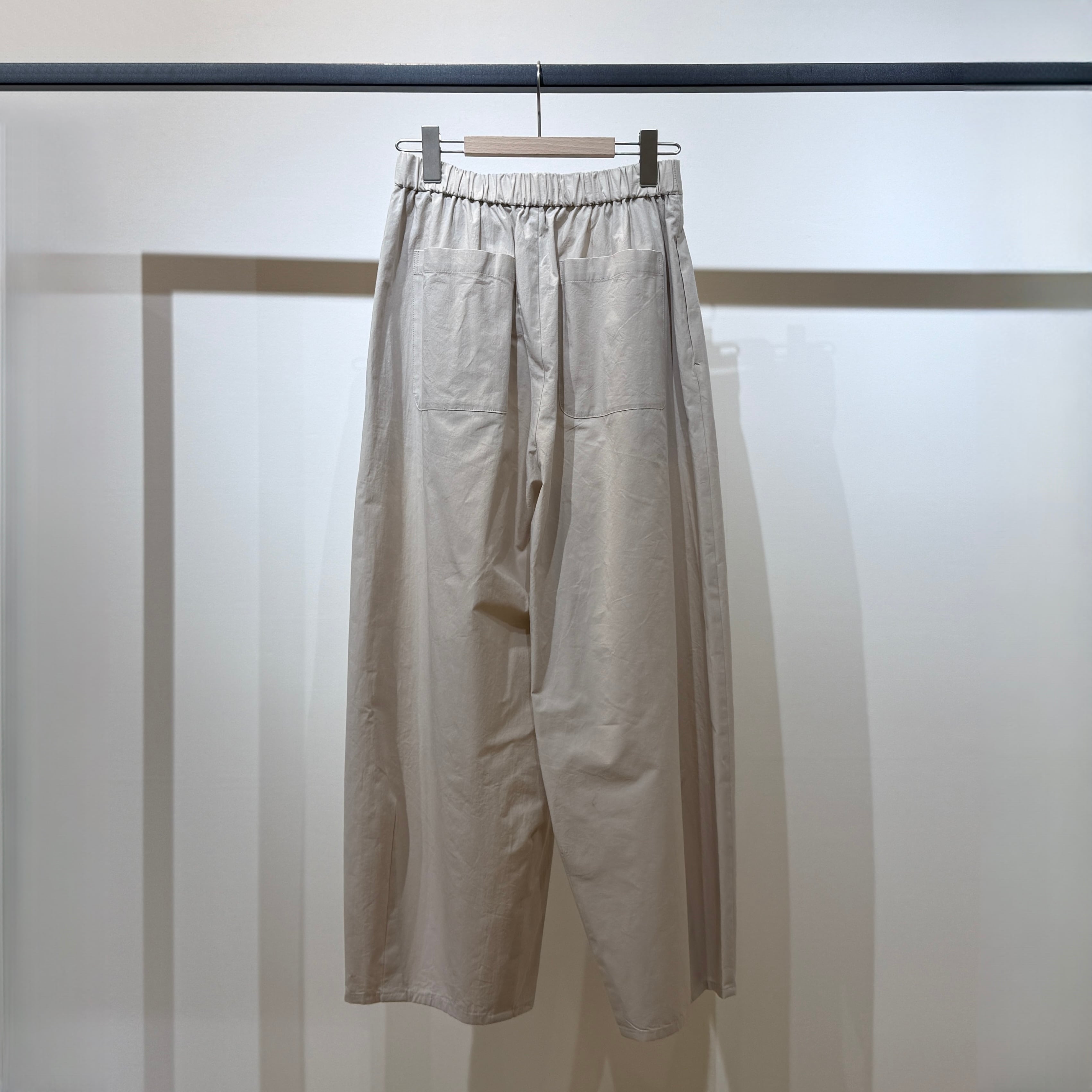 深めの股上とゆとりのある腰回りに、ややコクーンの立体シルエットで抜け感のある印象に。