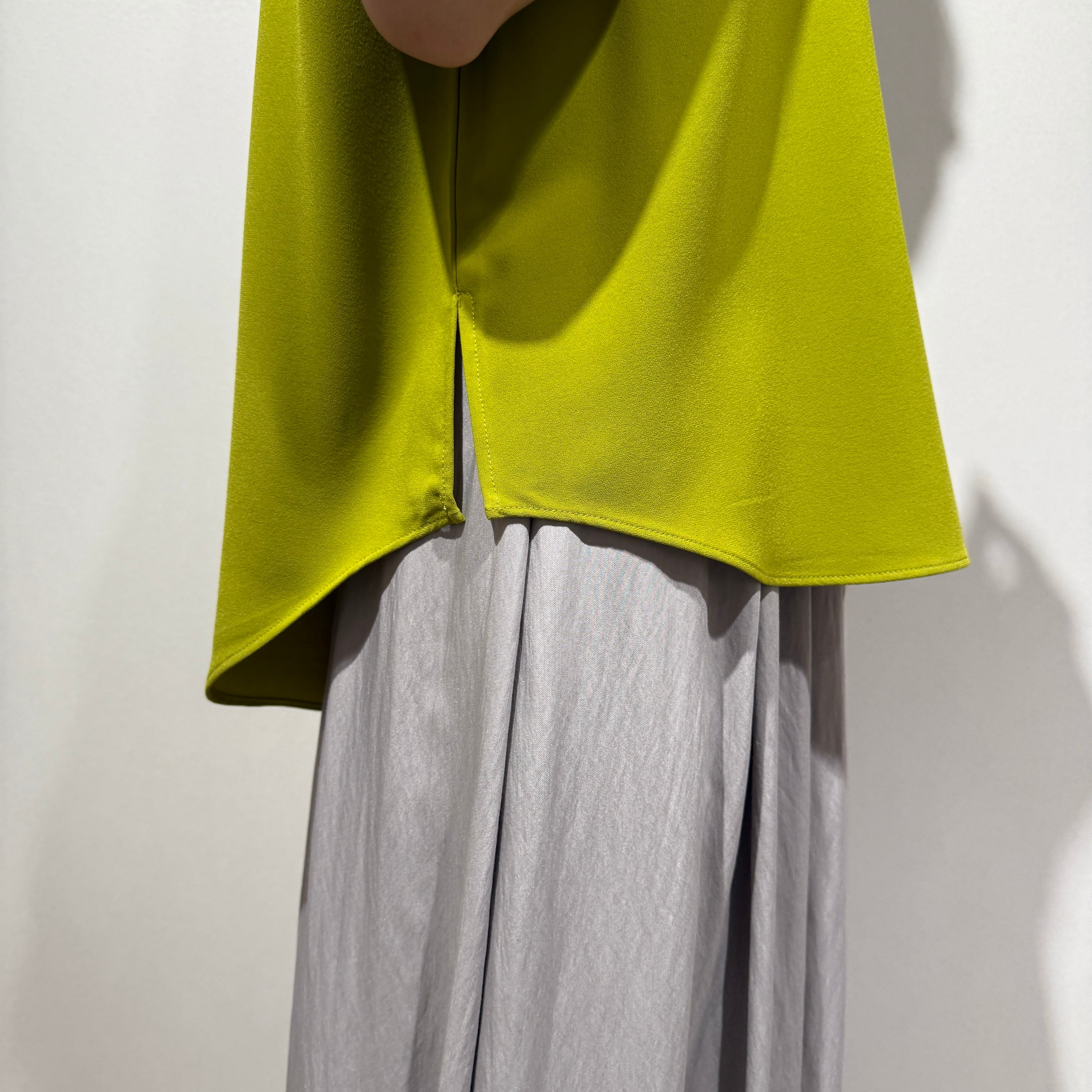 サイドスリットと前後差のある着丈がポイントで、自然とスタイルアップして見えるすっきりとしたシルエットに仕上がっています。