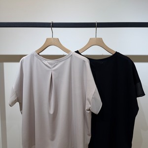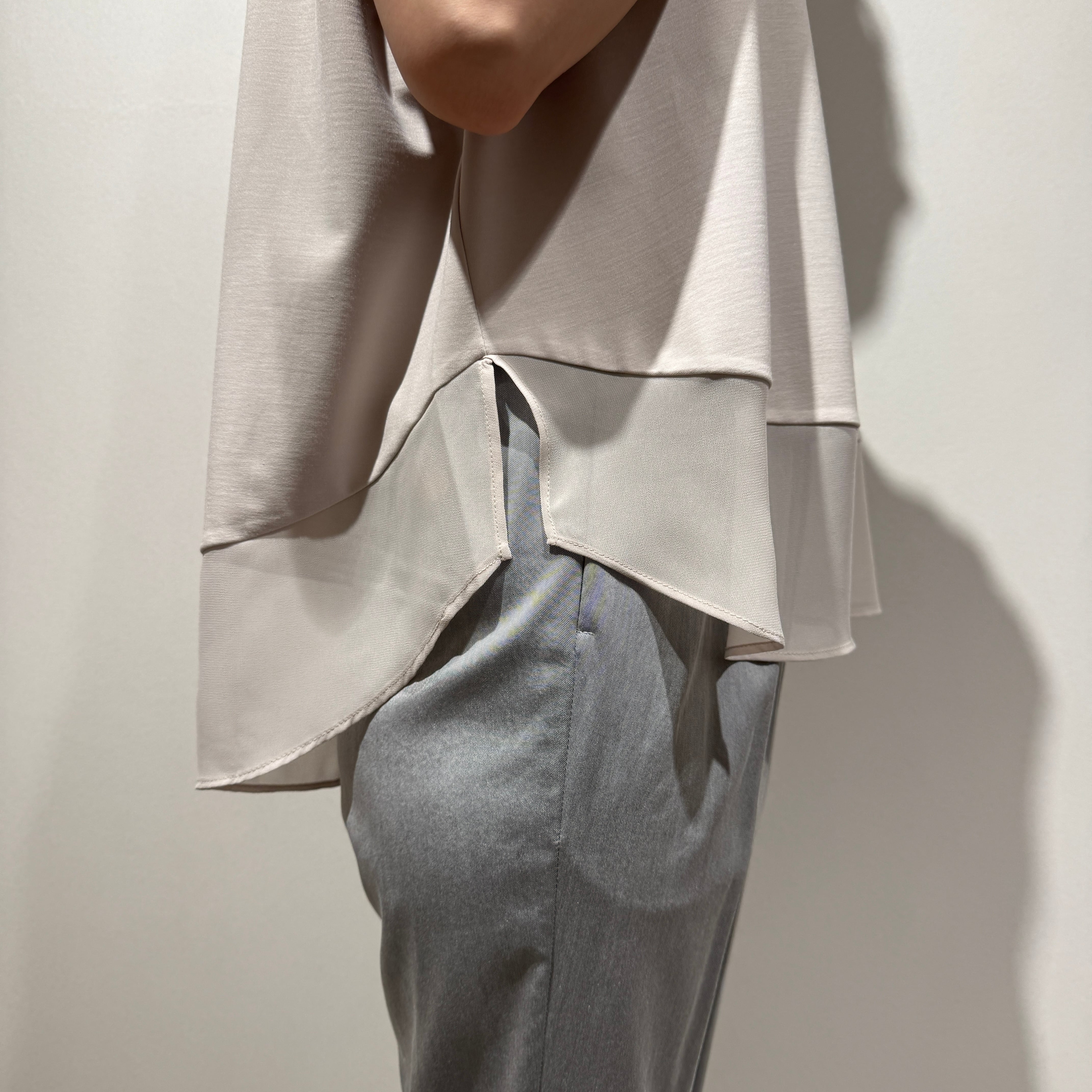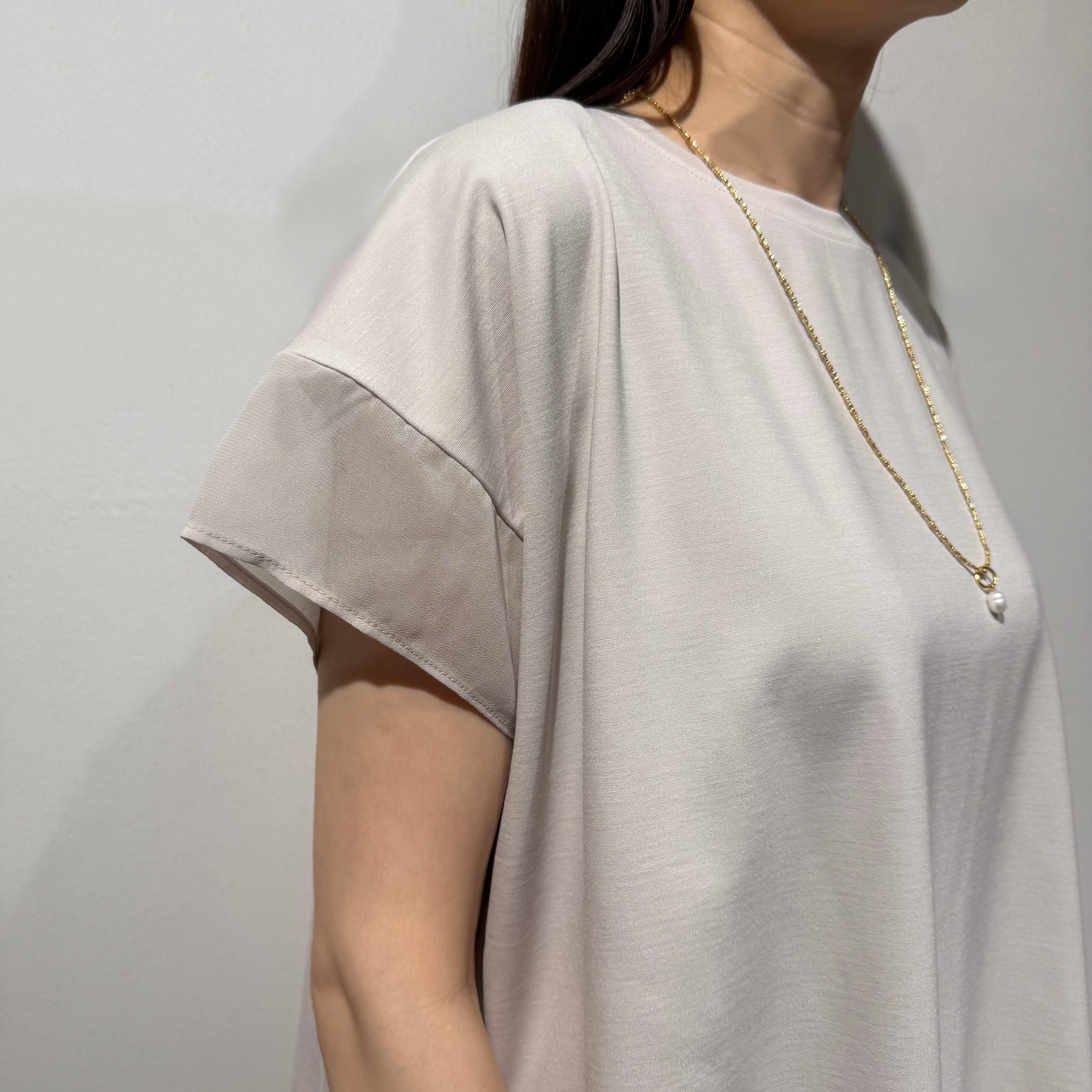 異素材の切替デザインとゆとりのあるシルエットで、体のラインを拾いにくくすっきり見えが叶います。