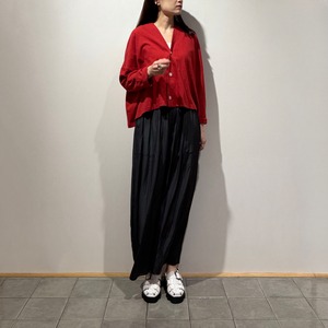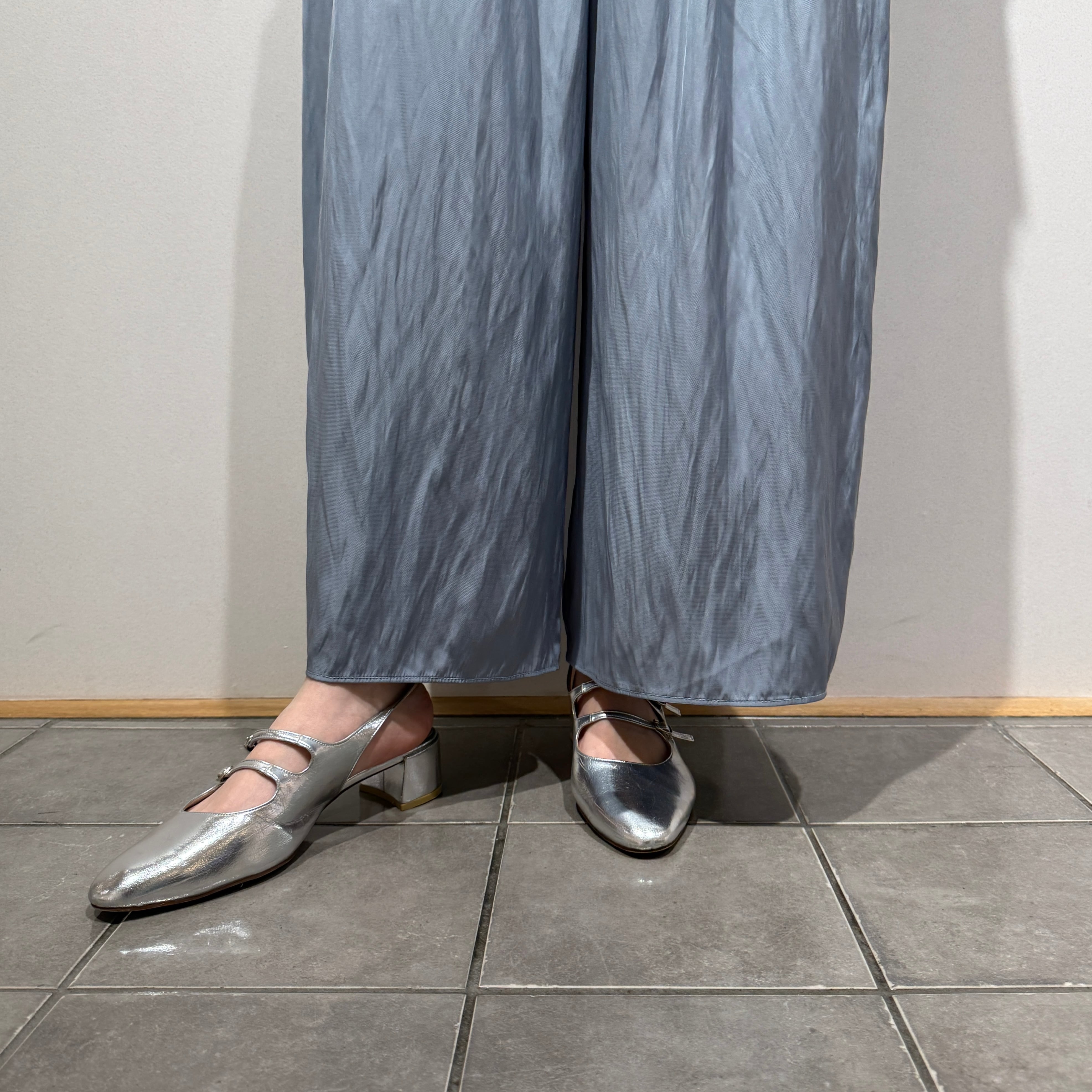 手で表情を変えられる不思議な素材で、絞ればシワ加工風、生地を伸ばせばキレイなフレアパンツに変化します。