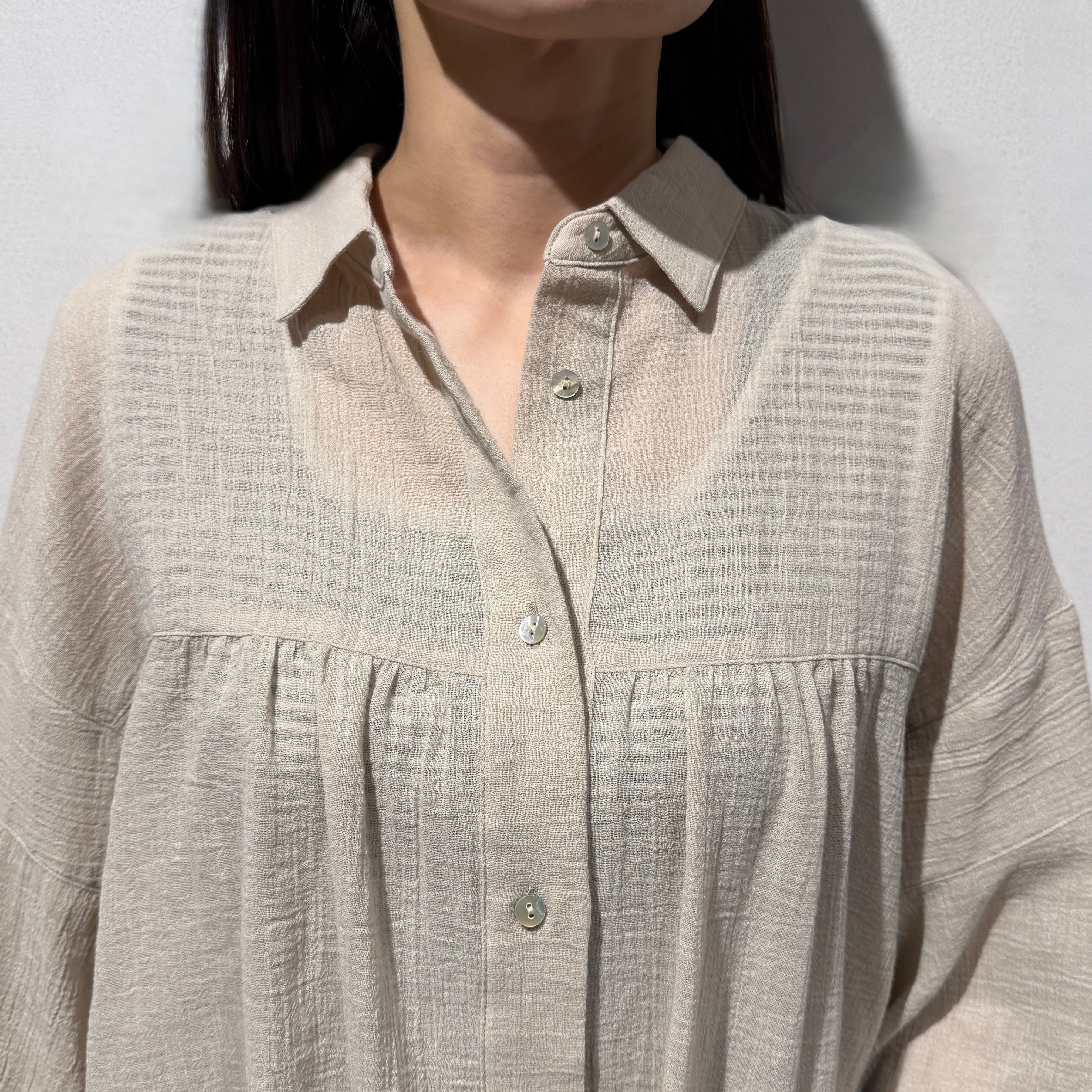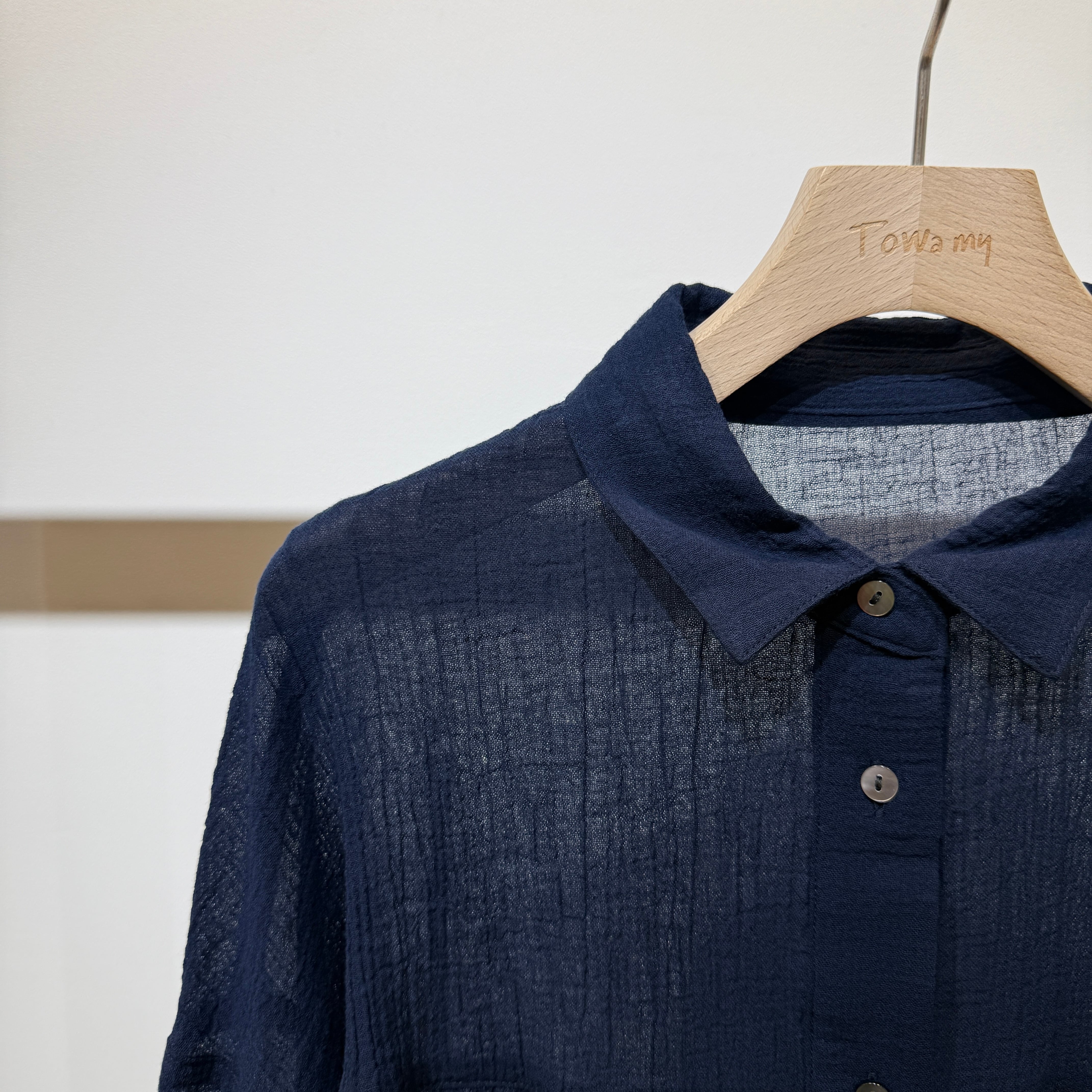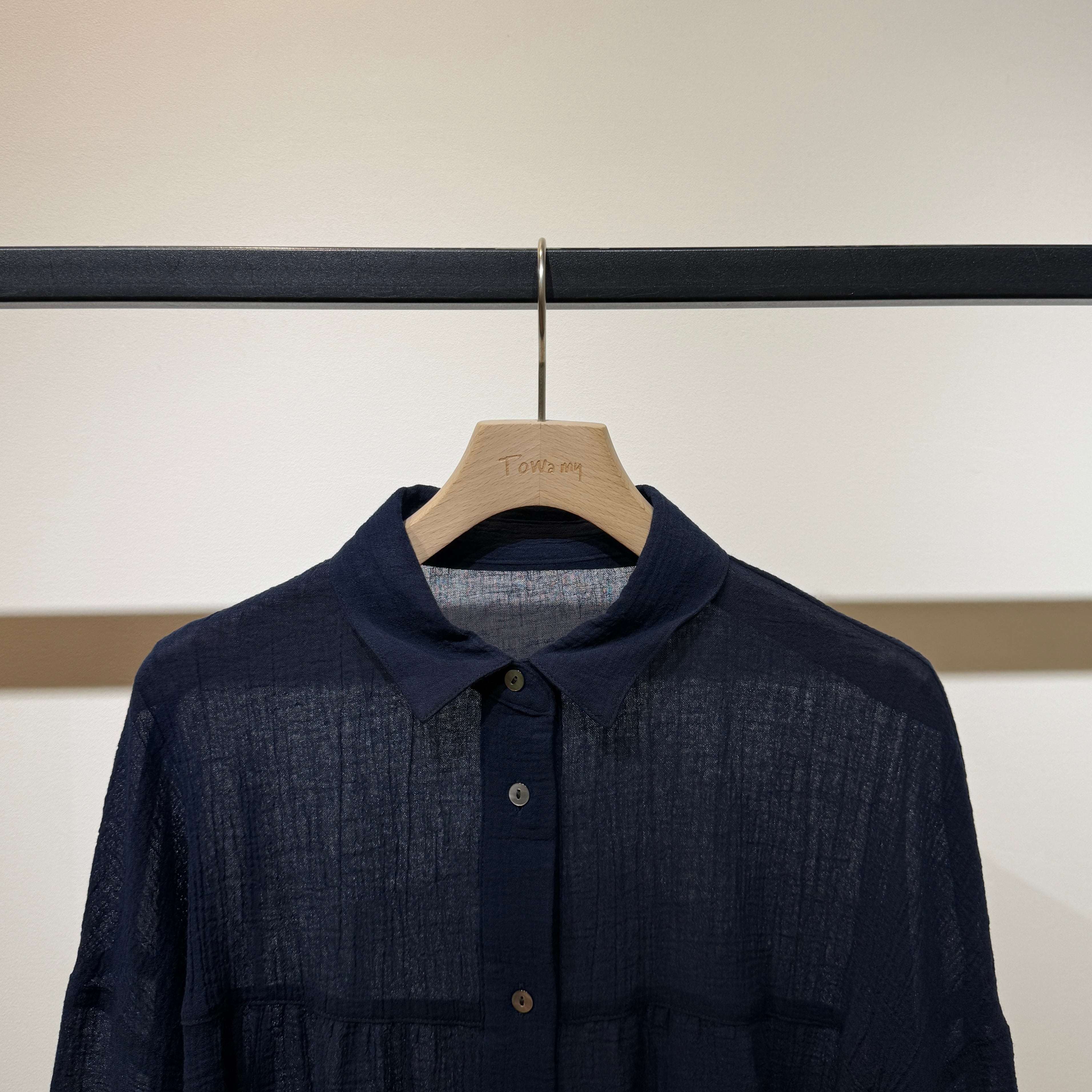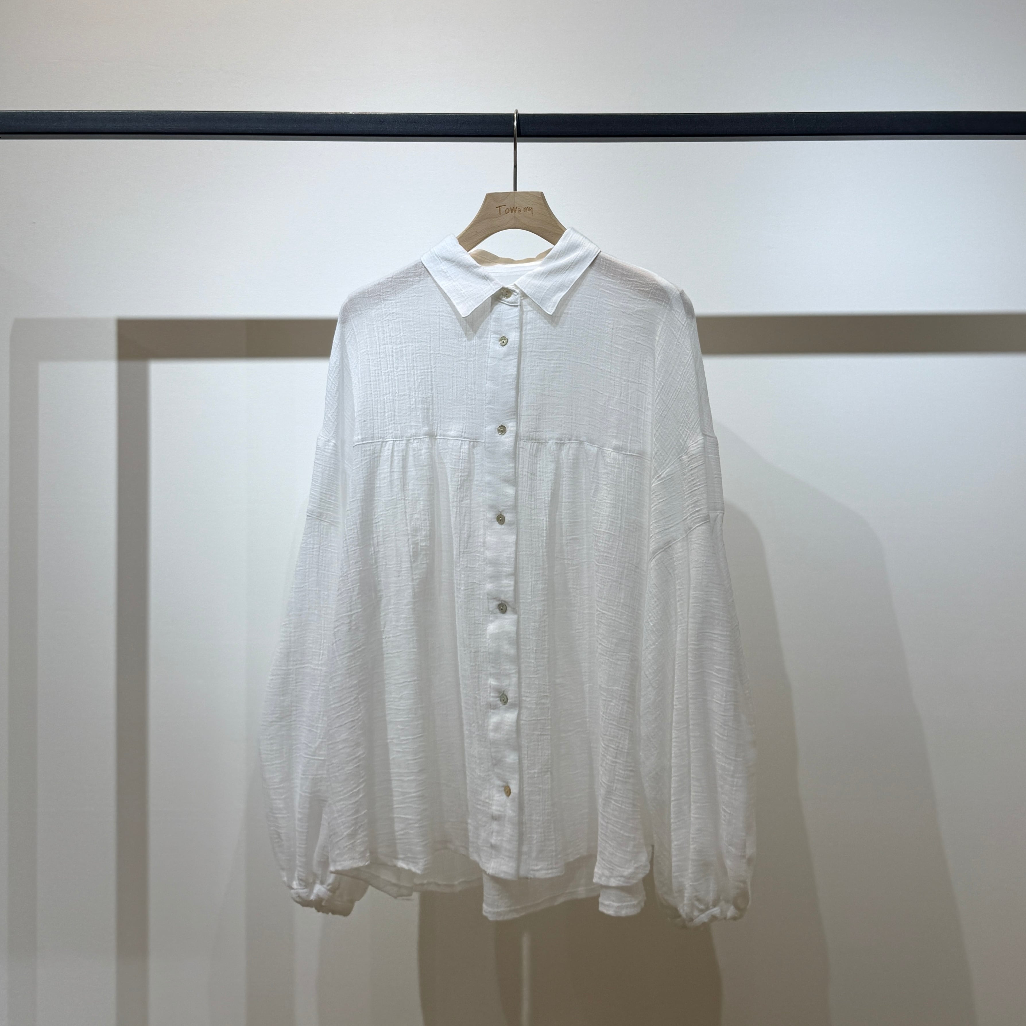Towamy別注!程よい透け感のある軽やかで肌離れの良い風合いの、ヨーク切替デザインの衿付きシャツ。