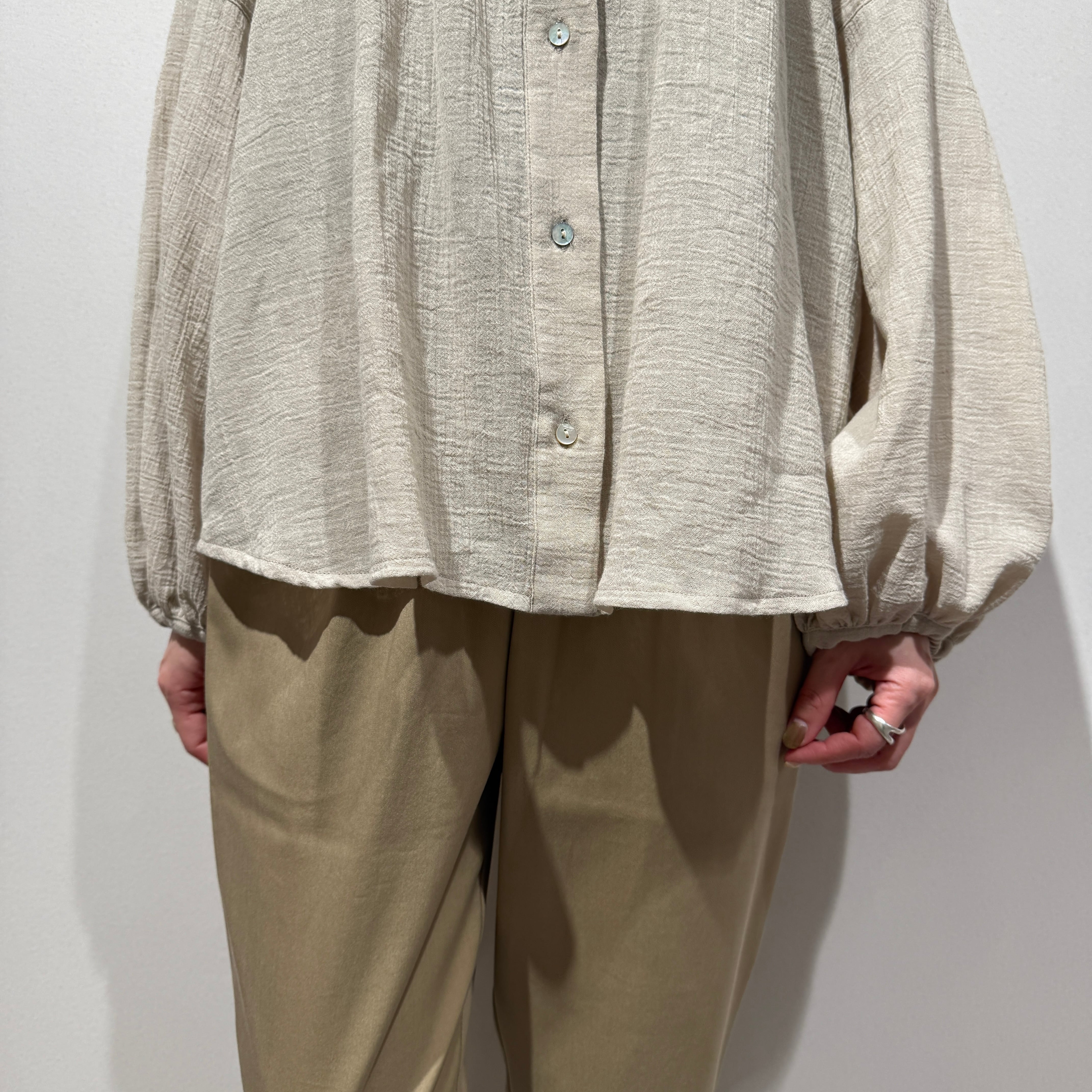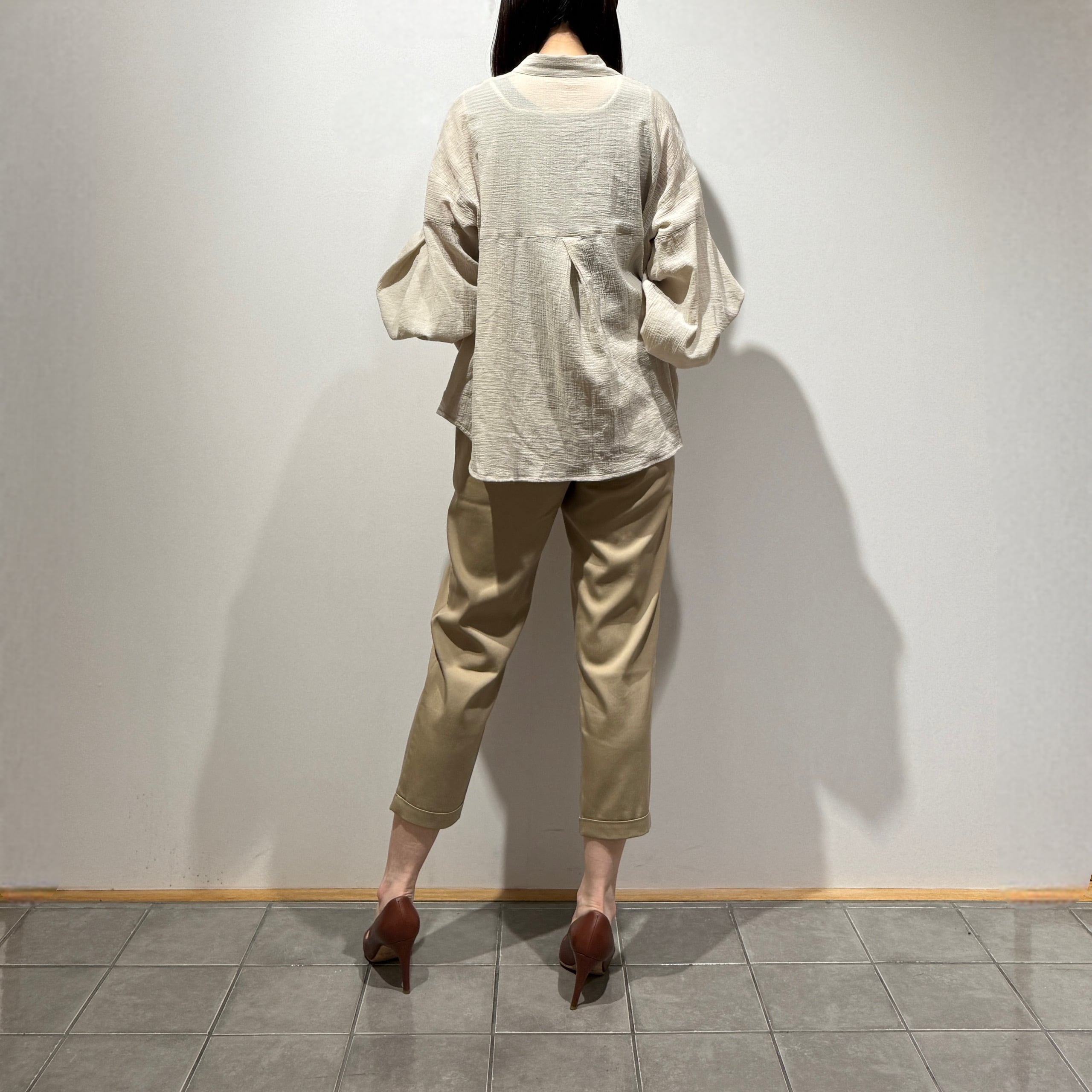 ヨーク切替とふんわりとした袖が女性らしく、さりげなく表情のあるシルエットに。