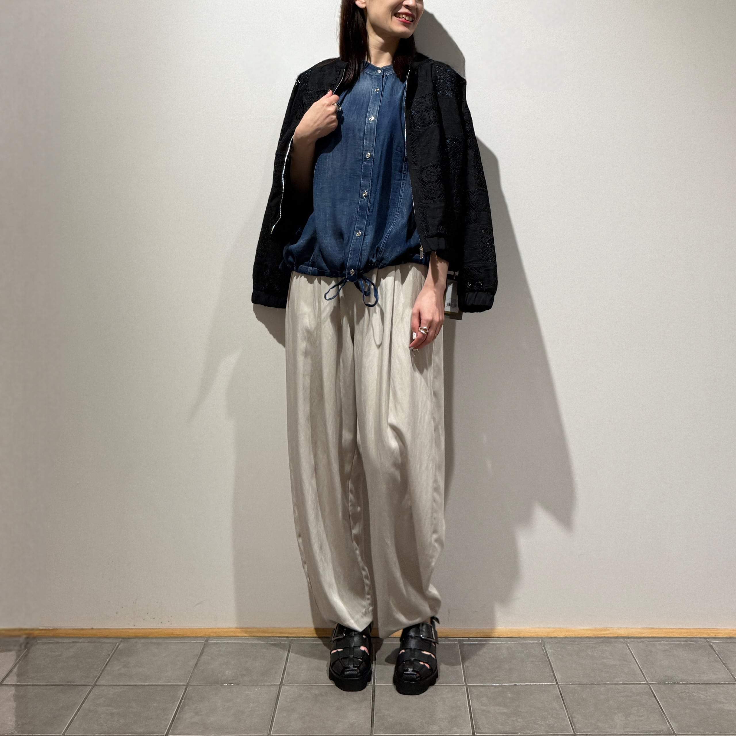デニムやワイドパンツにさらっと羽織るだけで、女性らしい軽やかなコーディネートが完成します。