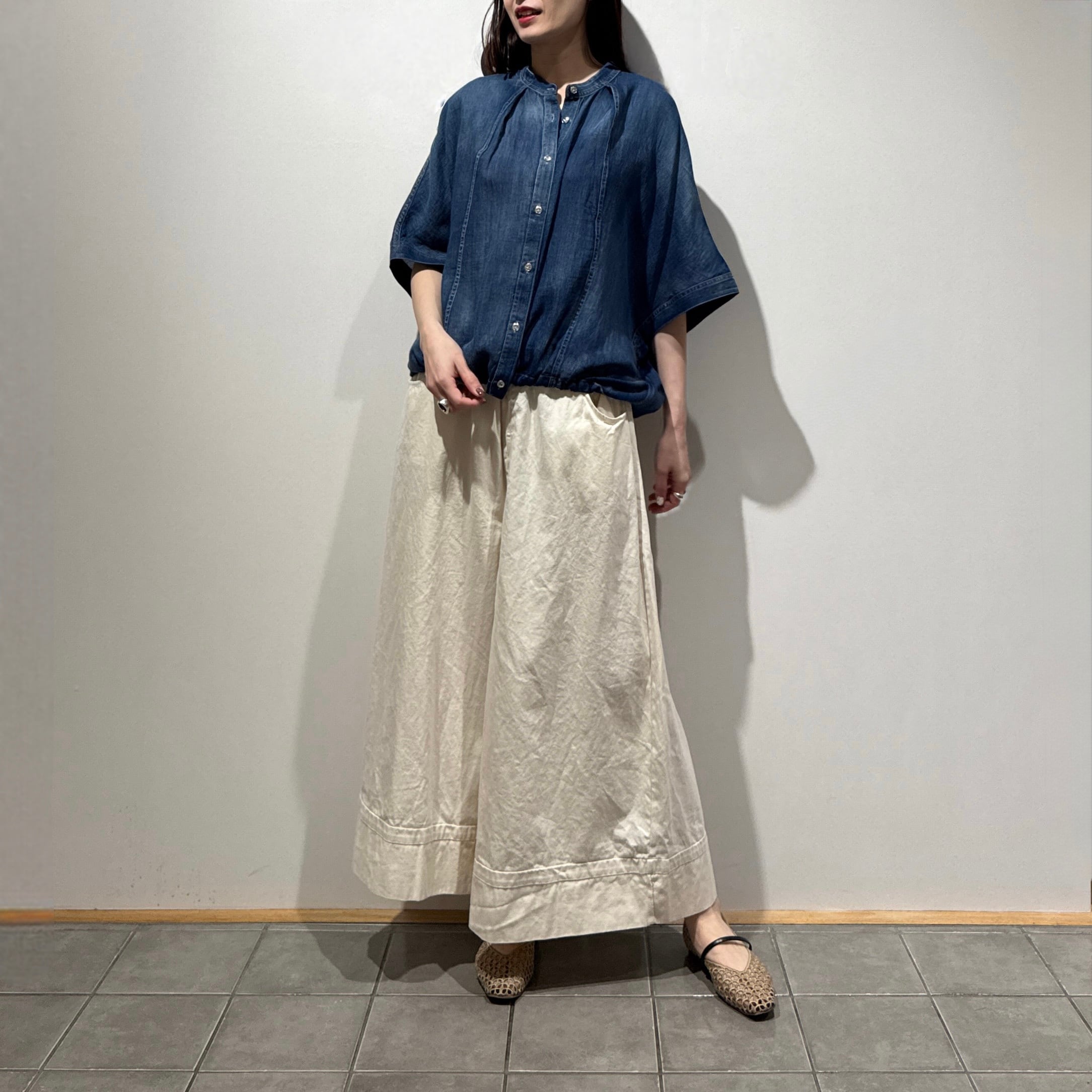 ゆったりとしたドルマンシルエットに裾紐でバルーンシルエットも楽しめ、きらりと輝くメタルボタンがさりげないアクセントに。
