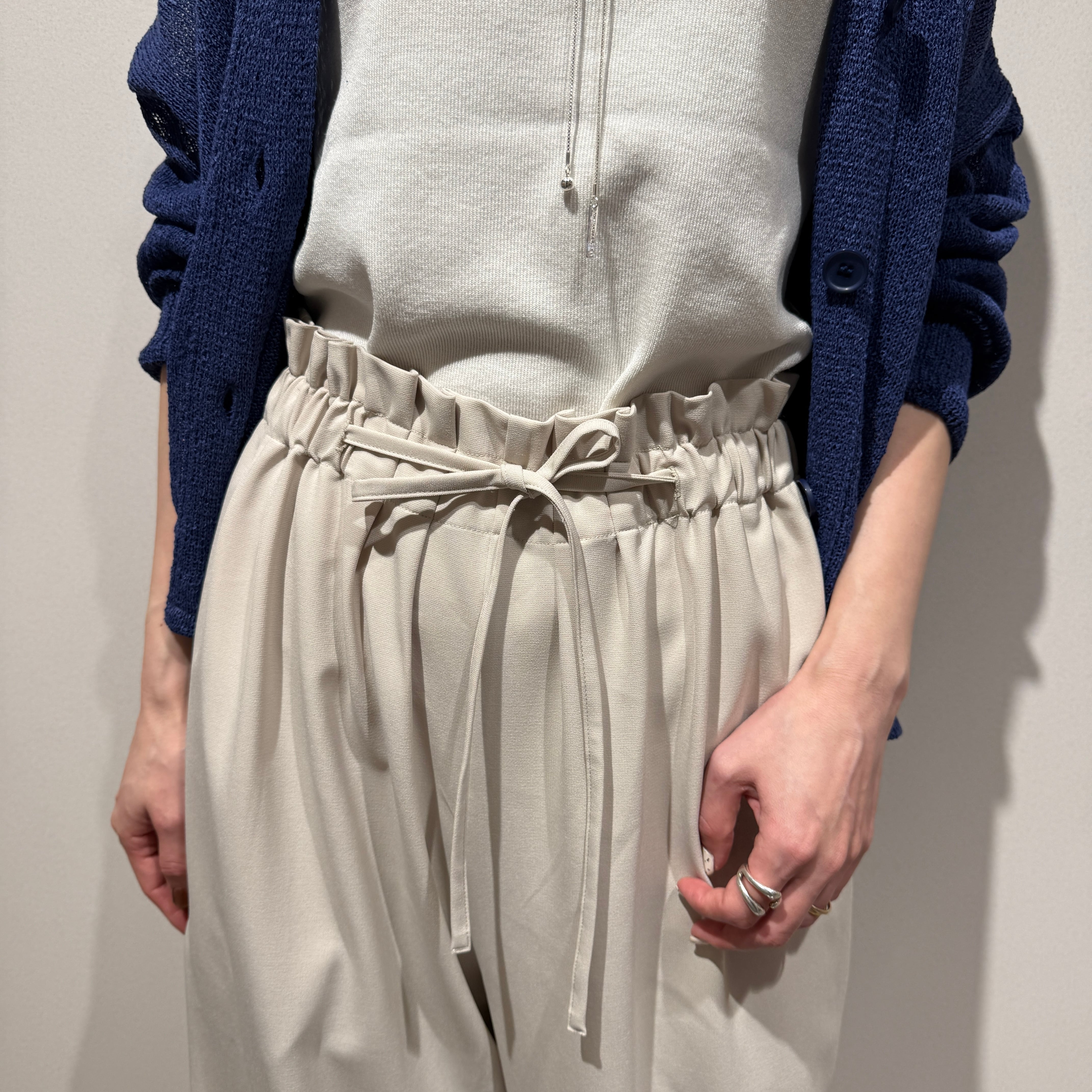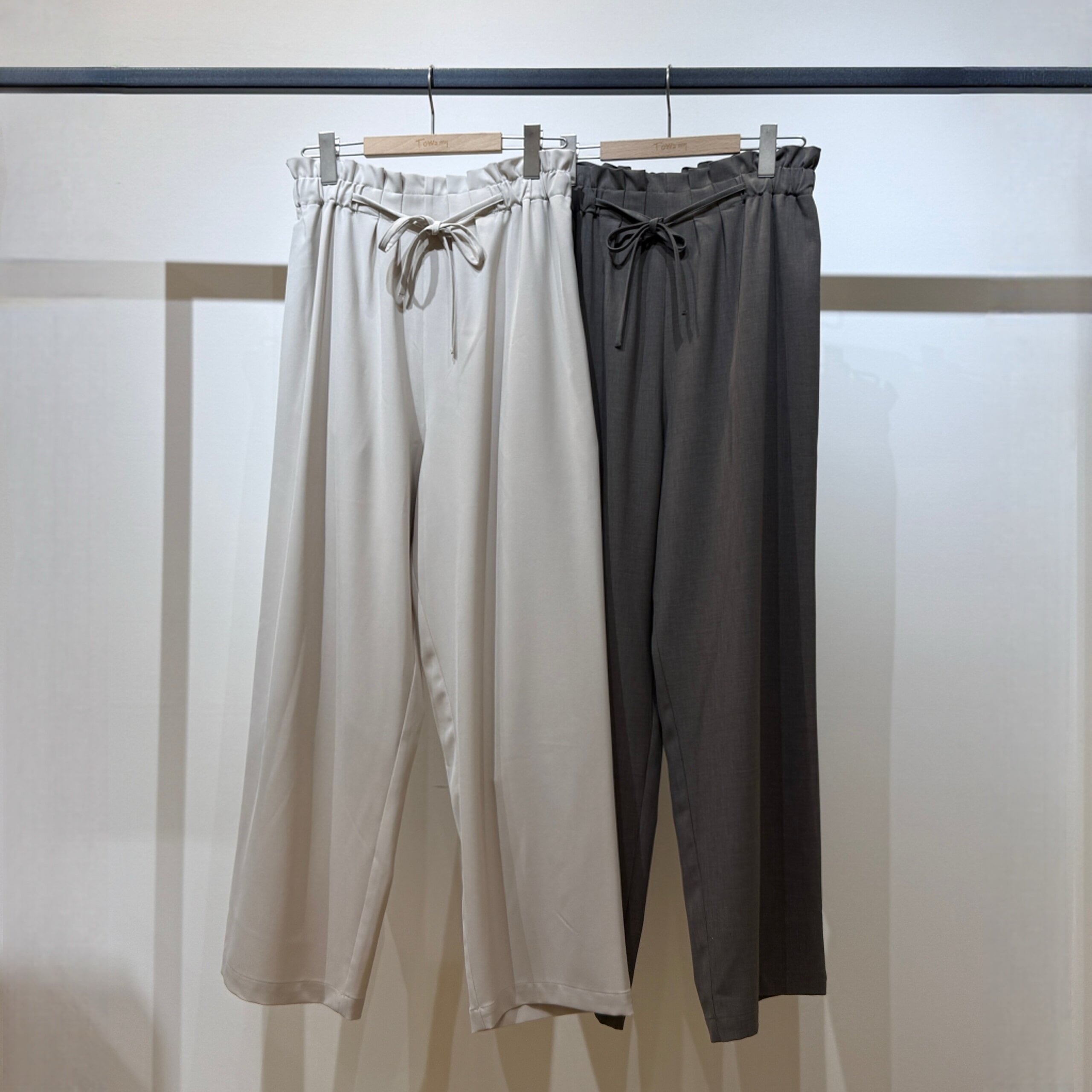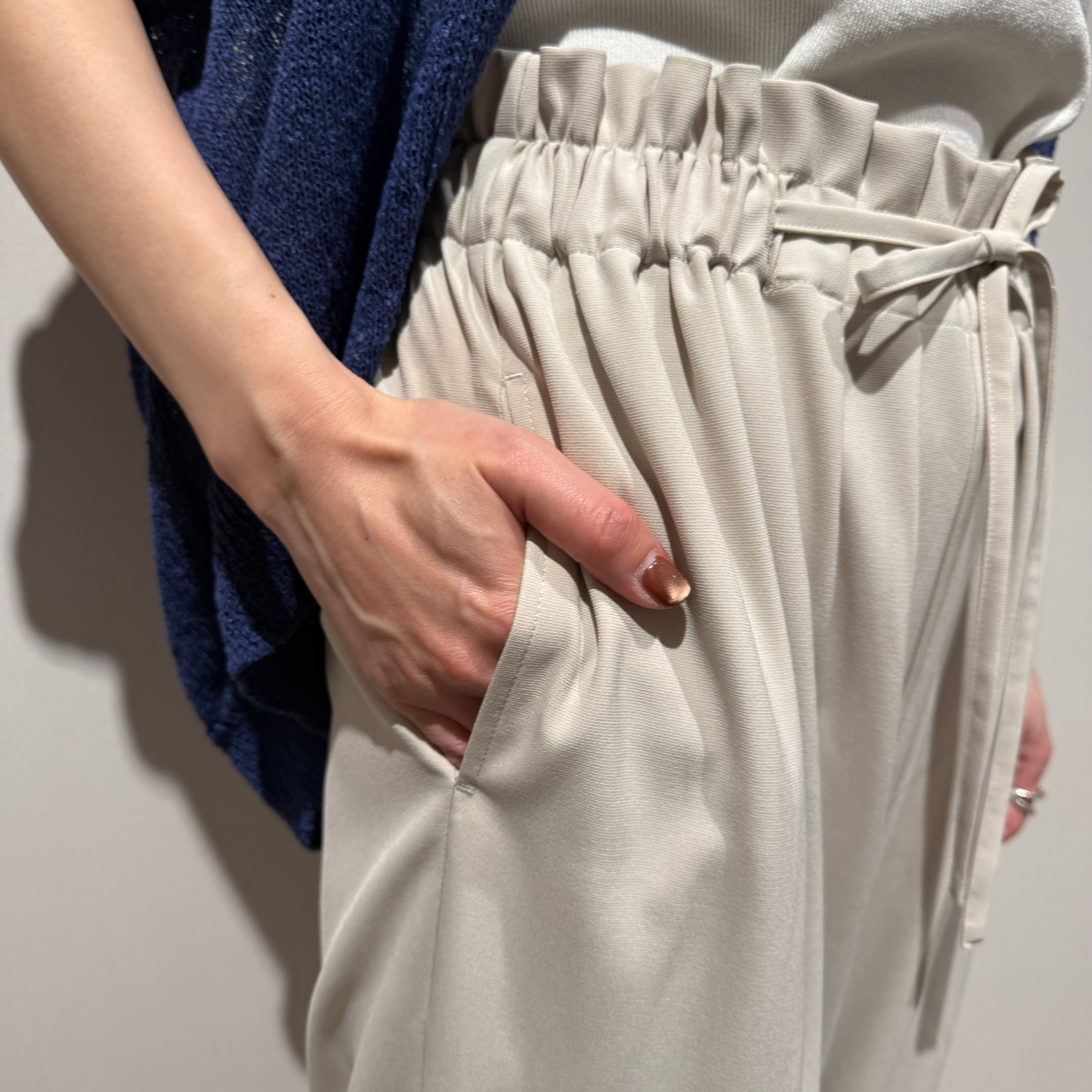 ぴったりしすぎずゆるすぎないテーパードシルエットに、フロントの共紐とギャザーがすっきり見えを叶えます。