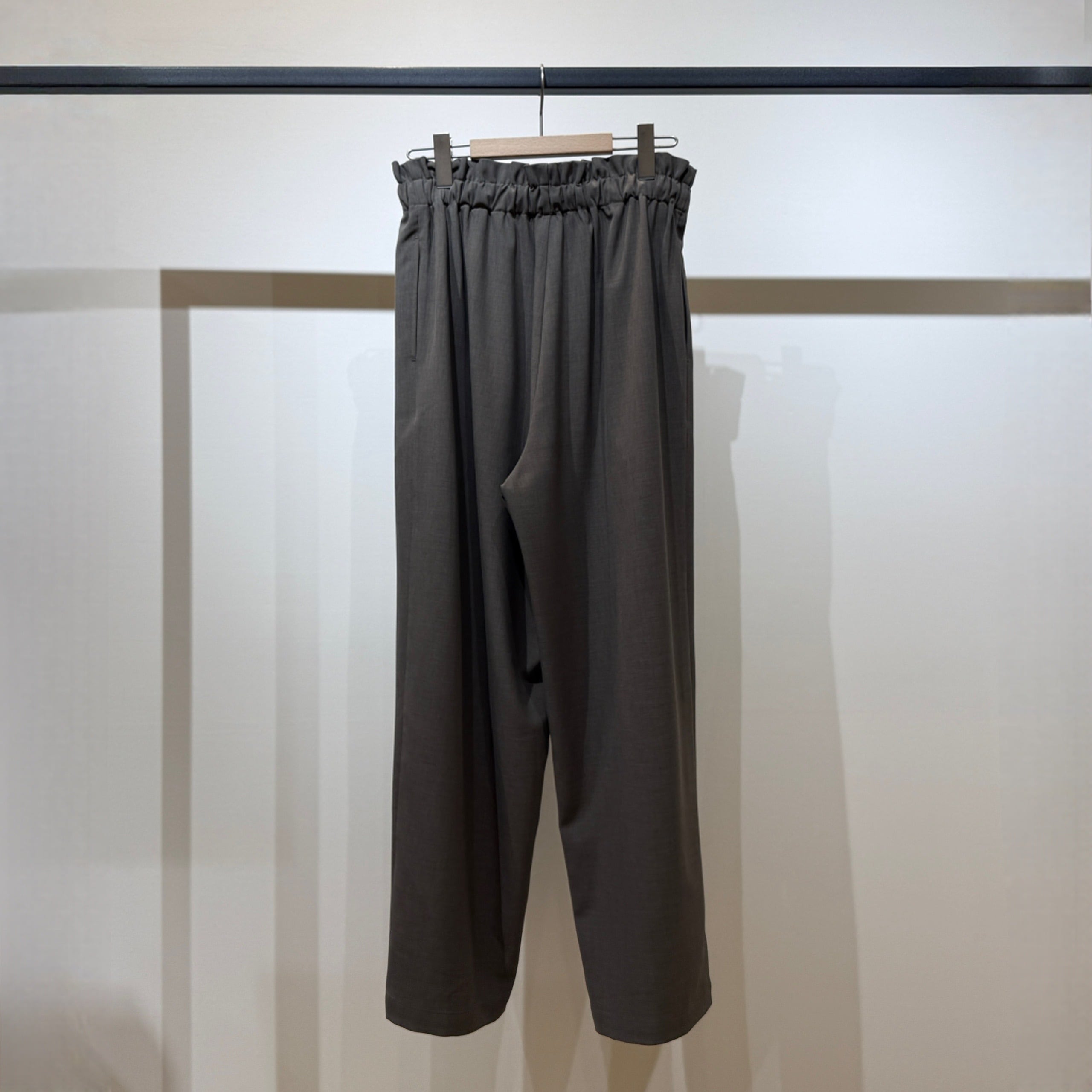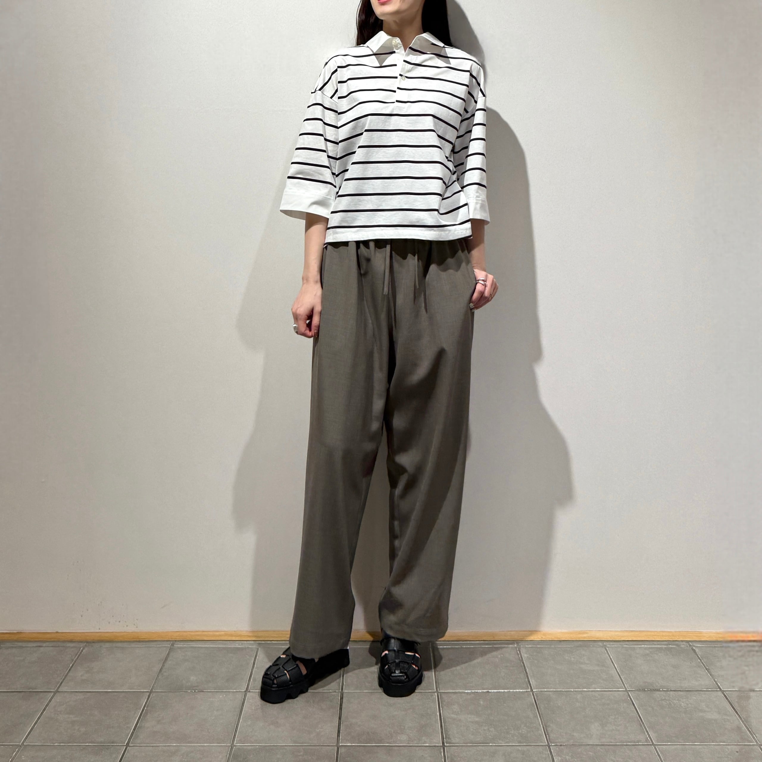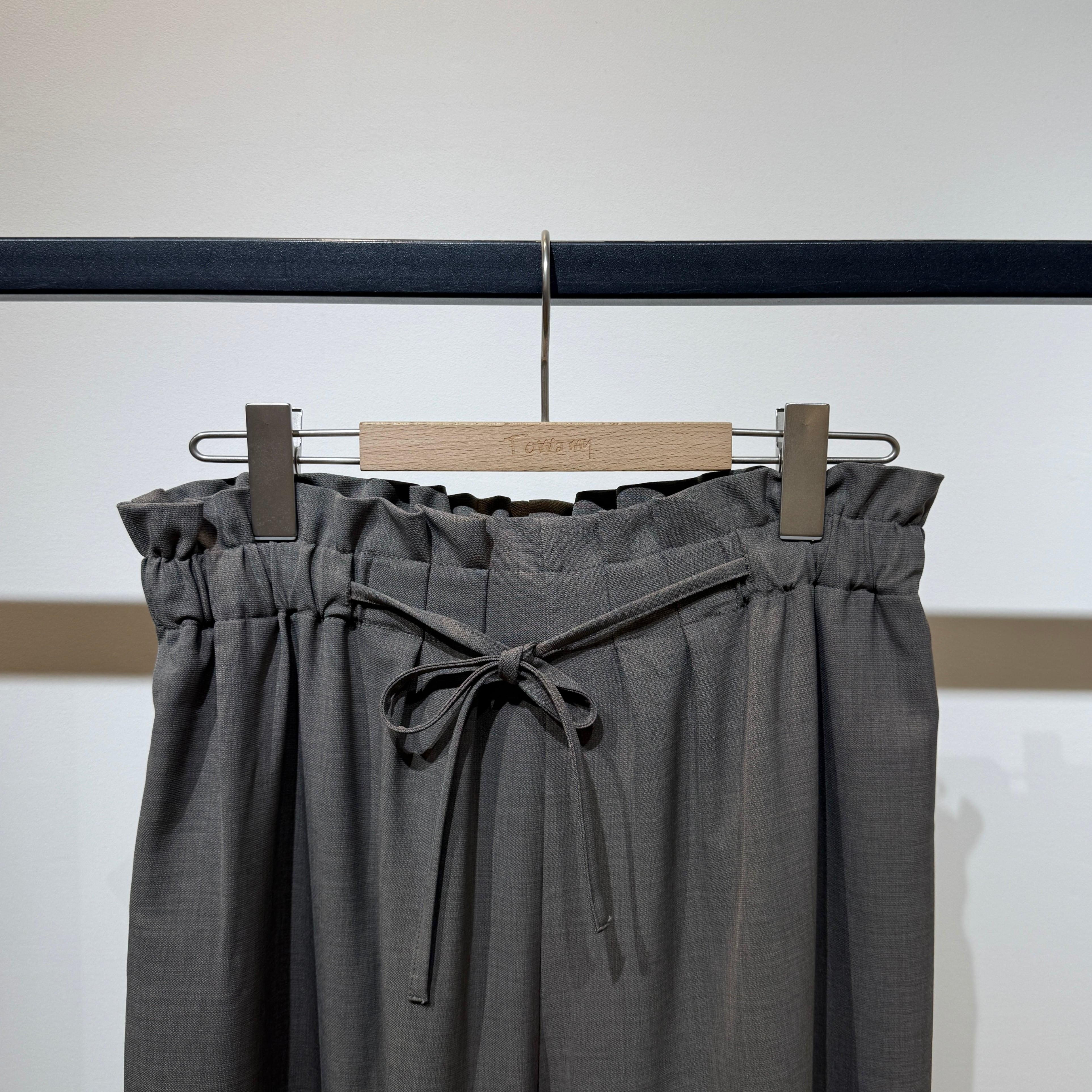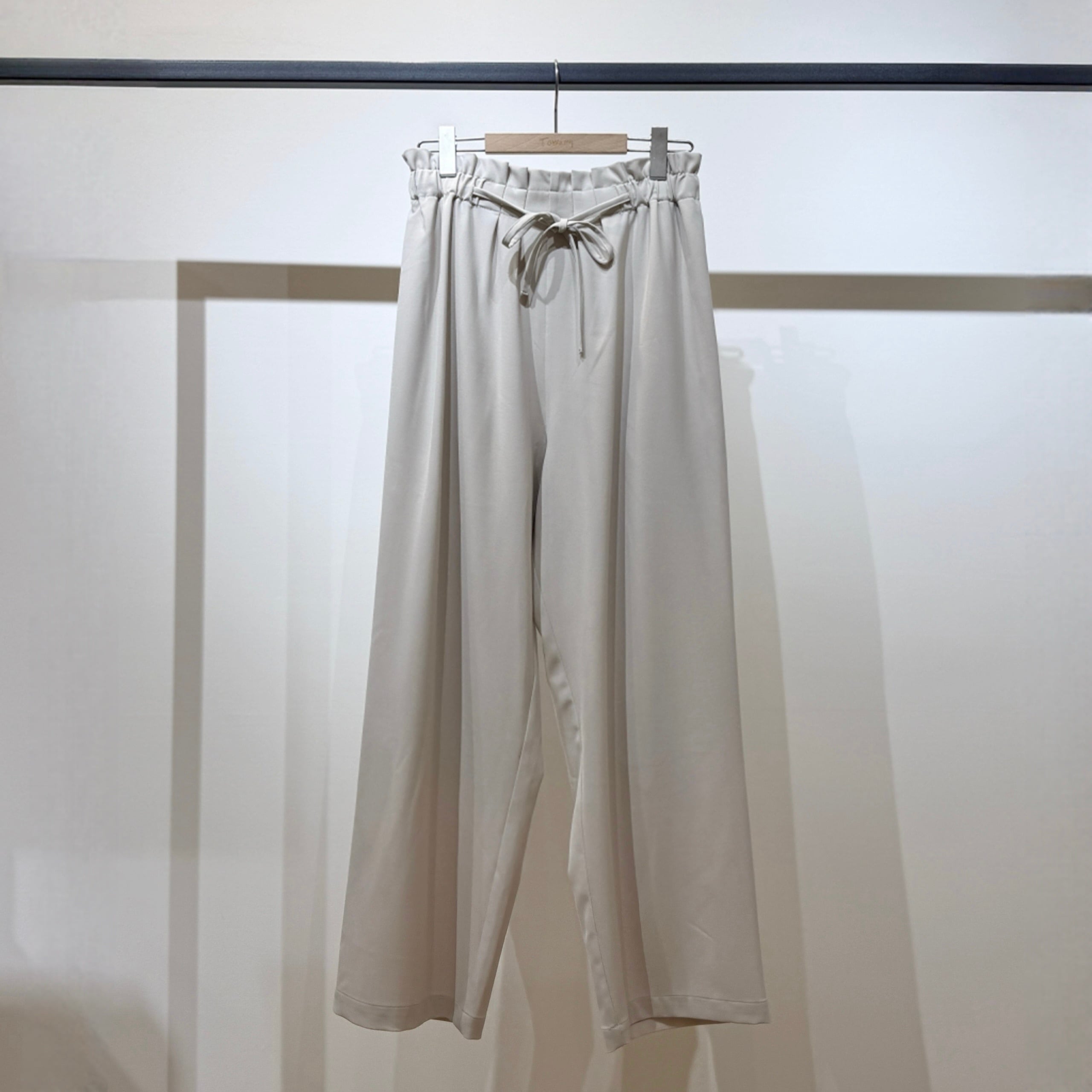 ぴったりしすぎずゆるすぎないテーパードシルエットに、フロントの共紐とギャザーがすっきり見えを叶えます。