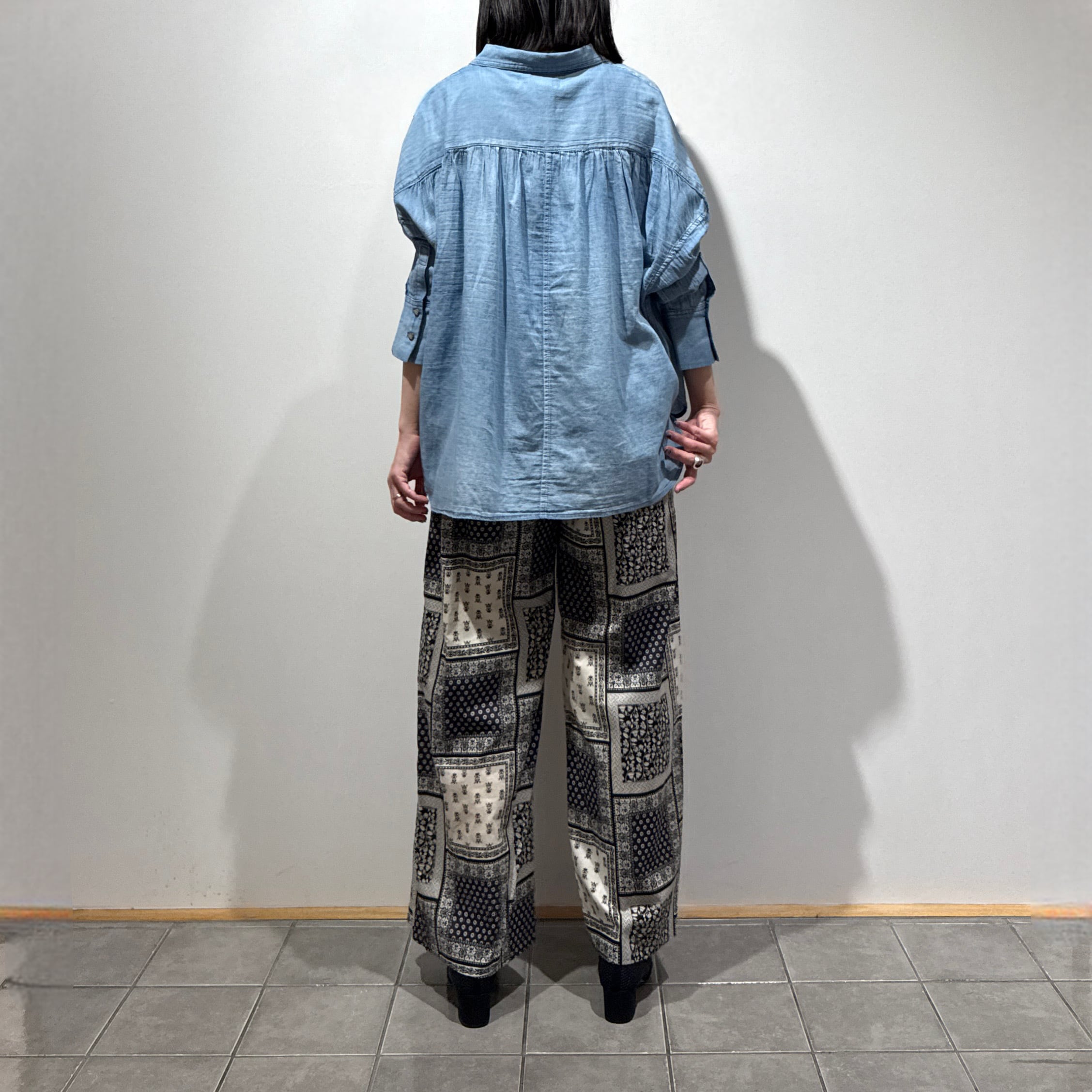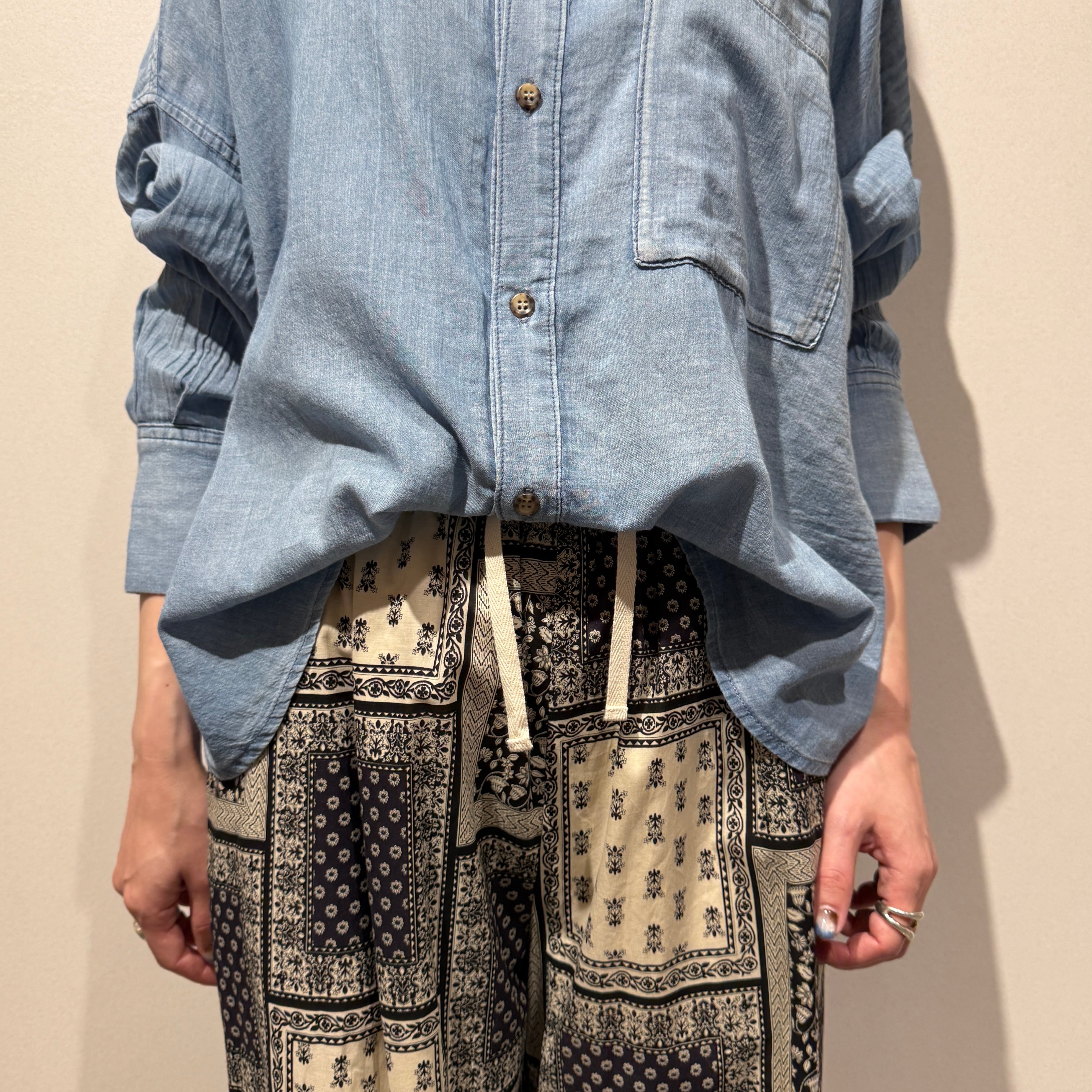 コンパクトな着丈でバランスが取りやすく、素材が薄いので肩掛けや腰巻きでも結び目がもたつかないのも嬉しいポイントです。